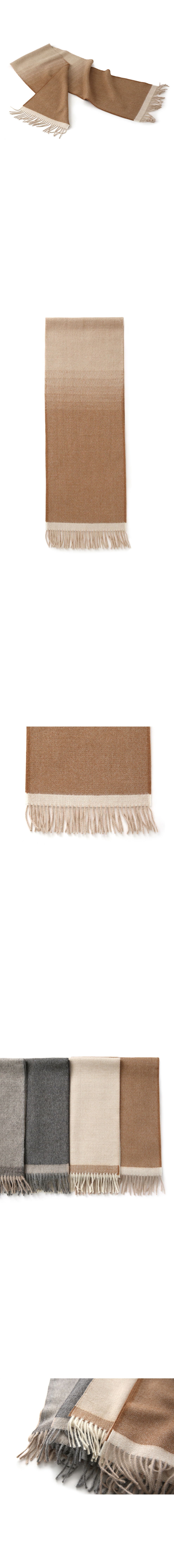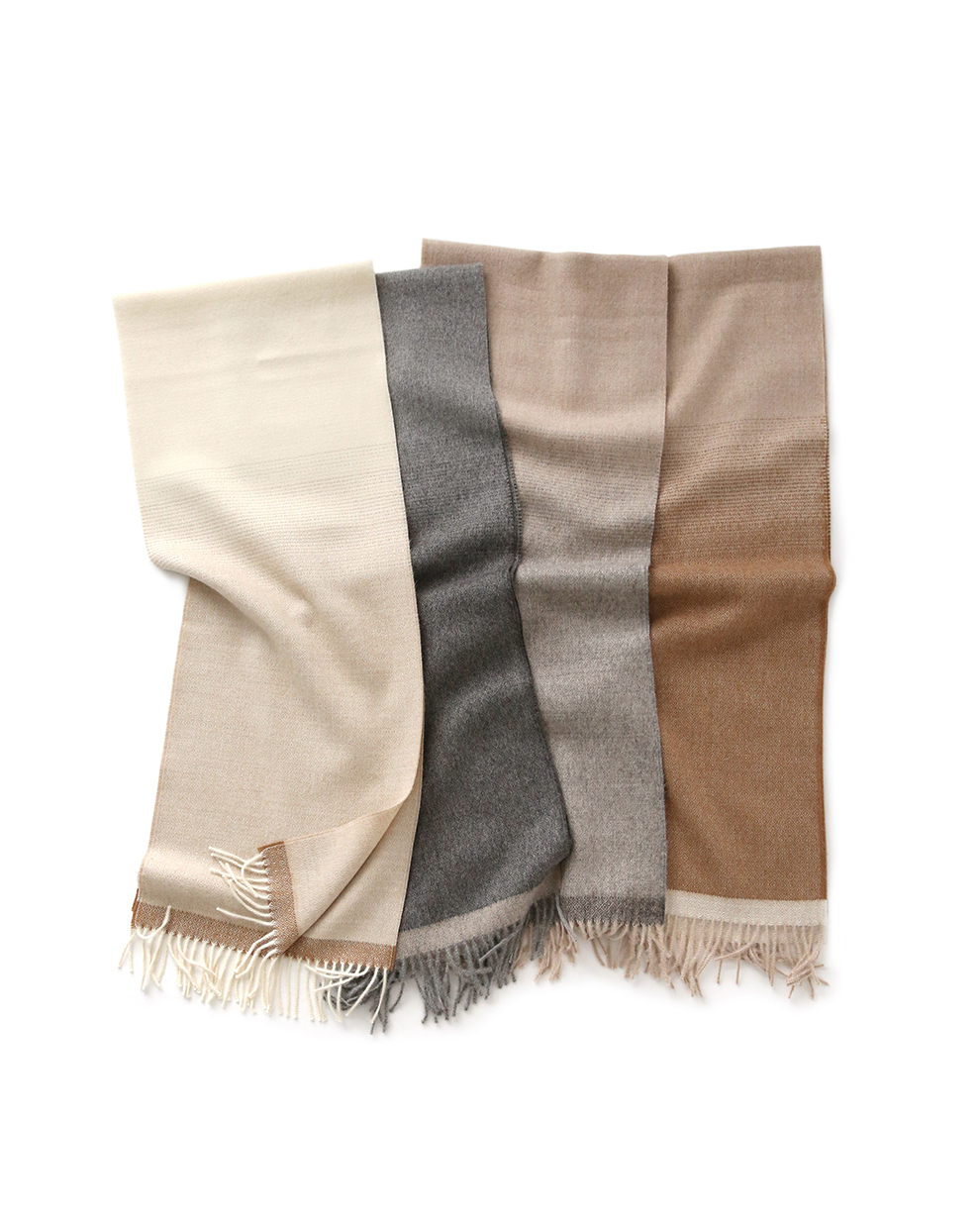 페루 베이비 알파카 100% 소재로 제작된 그라데이션 컬러의 머플러입니다. 사진 오른쪽부터 (1) 아이보리 베이지 (2) 그레이 차콜 (3) 베이지 그레이 (4) 베이지 브라운 컬러로 모두 네가지 타입으로 출시되었고요, 현재 베이지-브라운 소량 특가 이벤트 진행합니다. 우아하고 은은한 컬러감으로 어디에나 부담 없이 연출하기 좋습니다. 컬러 뿐 아니라 패턴까지 그라데이션으로 완성된 까다로운 공정으로 더욱 고급스럽고 유니크한 무드를 선사합니다.