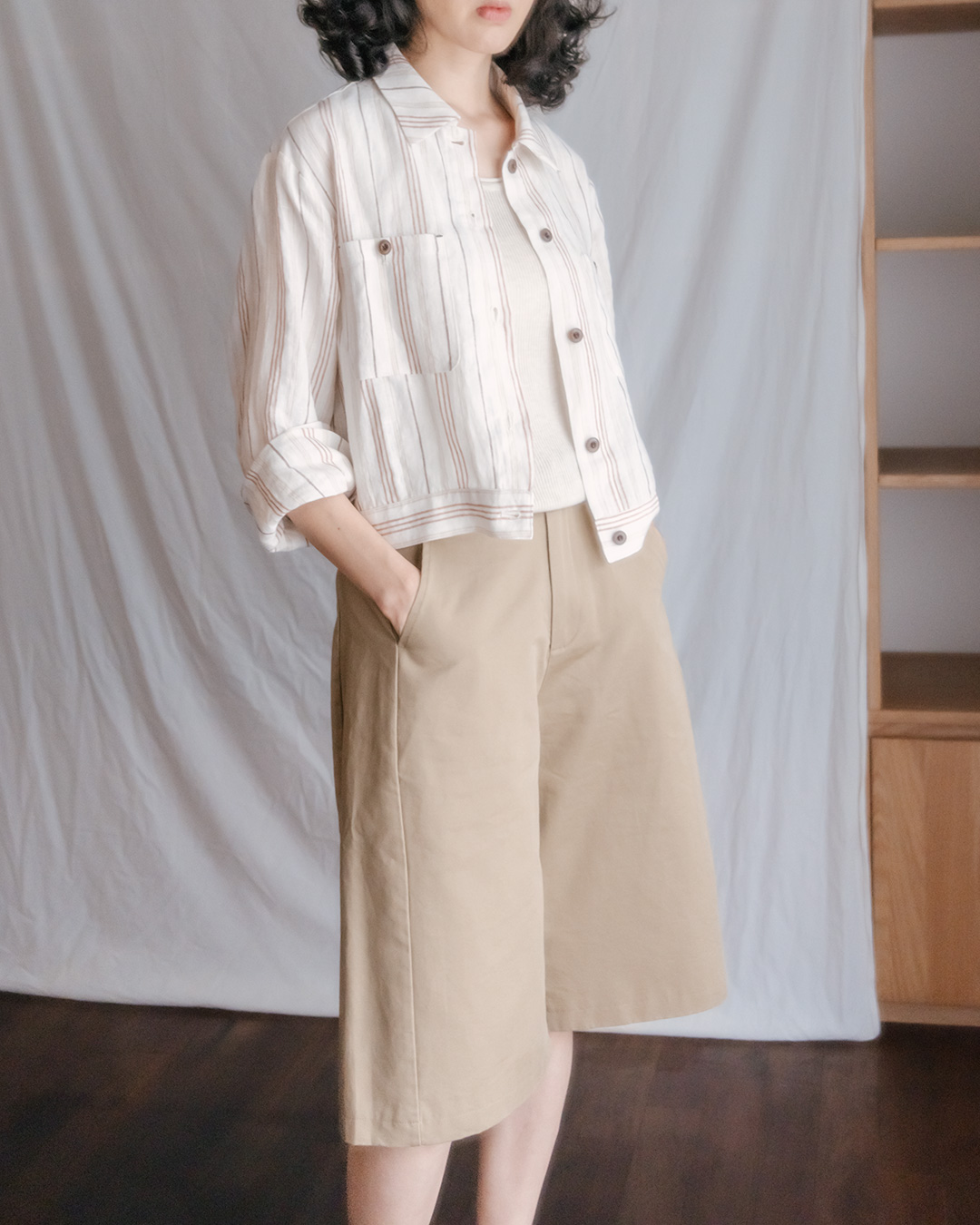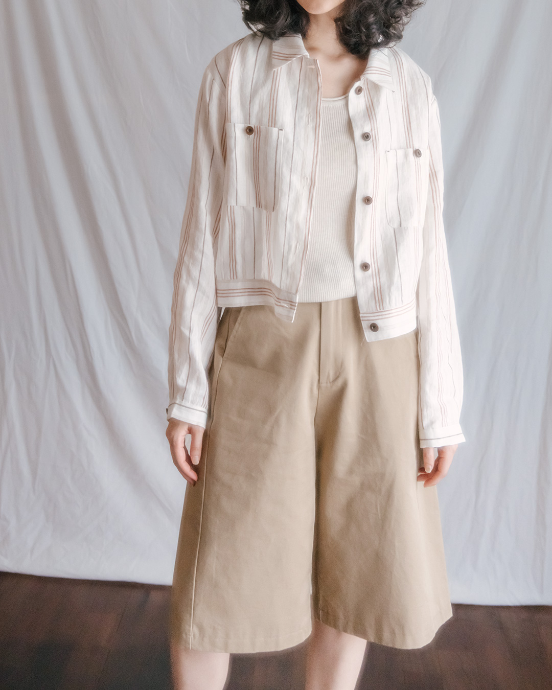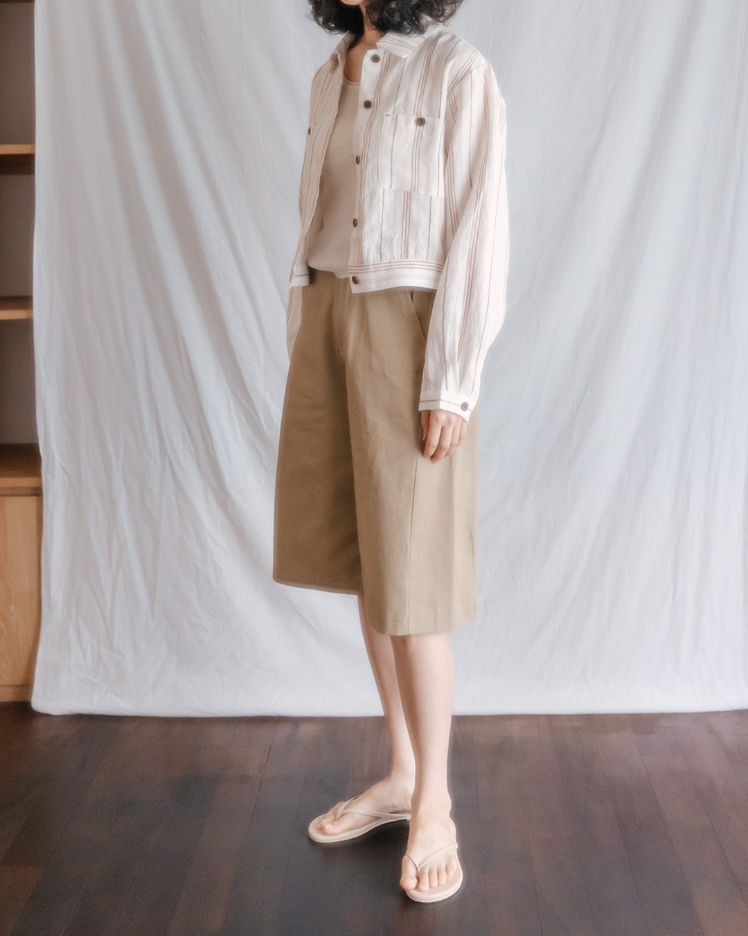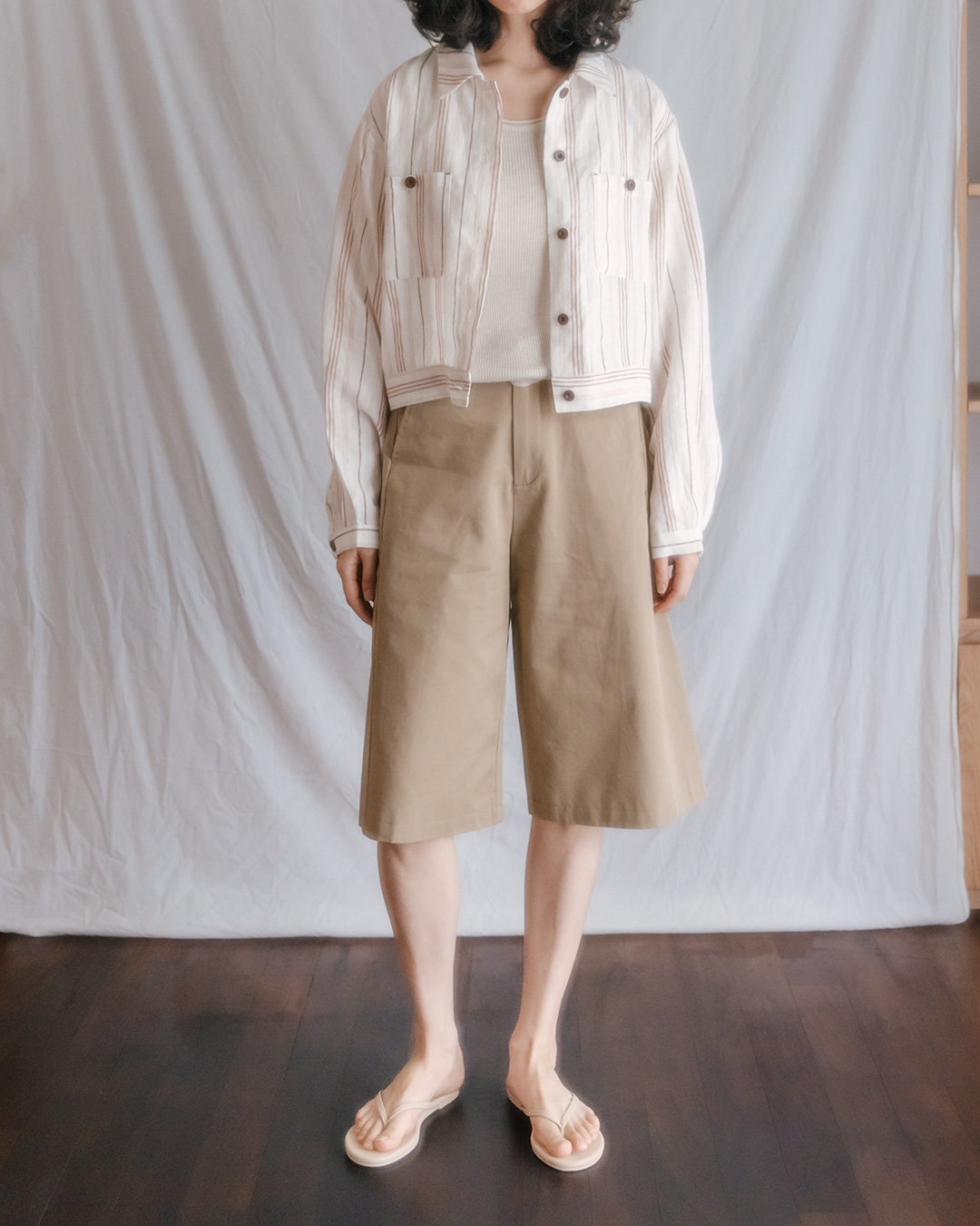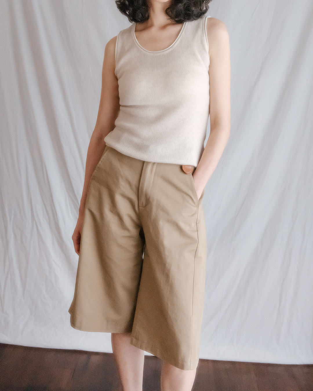 100% cotton (long staple cotton) Lined No stretch / No sheerness / Normal thickness Almost no gloss / Fresh and smooth texture / Relatively lightweight Bermuda fit that falls loosely from the thighs M(-55.5) : Total Length 62.5 Waist 35.5 Hips 54.5 Thigh 35.5 Hem 33 Crotch 30.5 L(-66.5) : Total Length 63.5 Waist 37.5 Hips 56.5 Thigh 36.5 Hem 34 Crotch 31.5 Model is 168cm tall and wearing Size M (55-66).