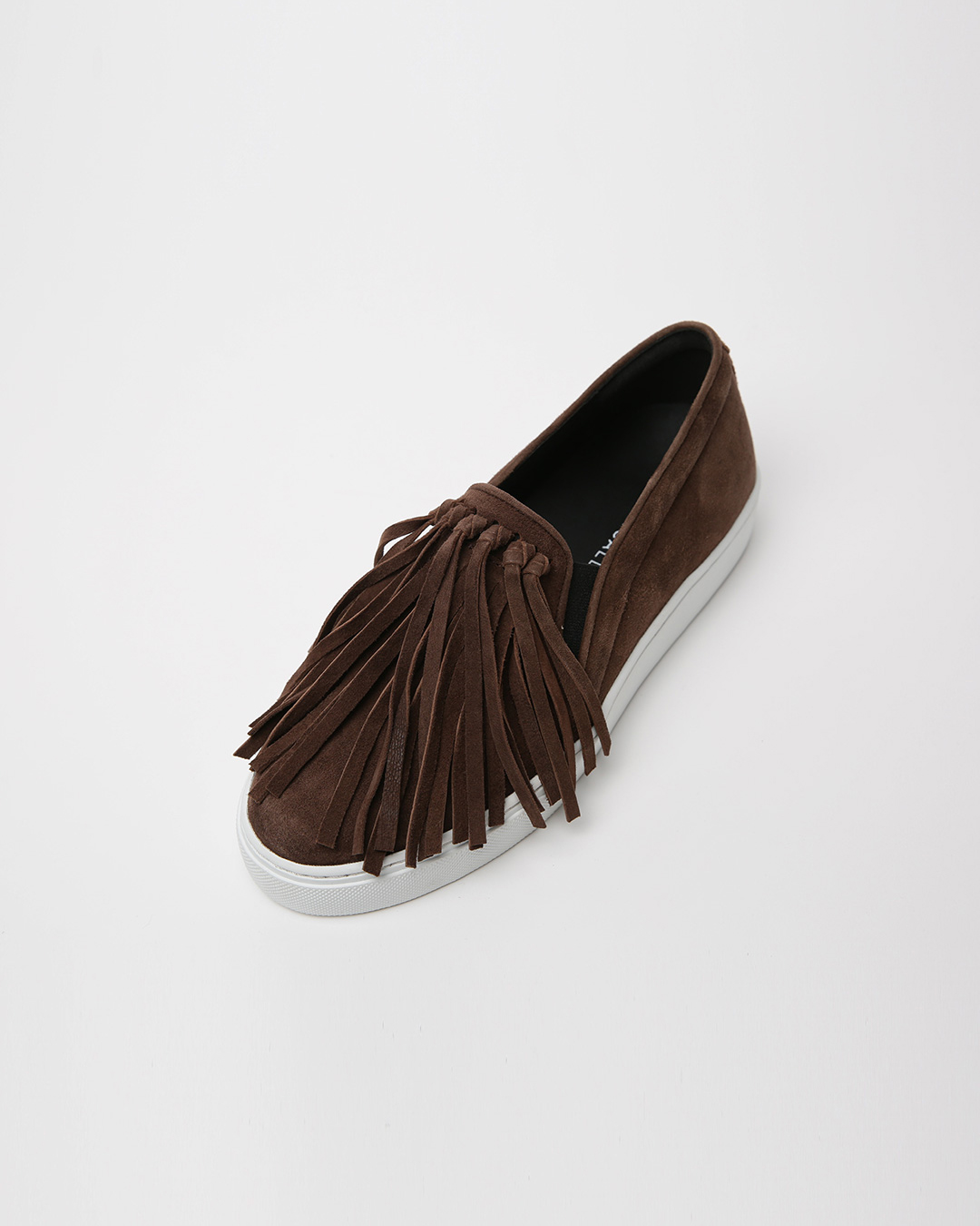 귀여운 슬립온 스타일에 고급스러운 양가죽 스웨이드 소재로 고급스러움을 더한 스니커즈. 따스해보이는 이중 이중 프린지 장식 포인트랍니다. 발걸음마다 느껴지는 찰랑찰랑하고 풍부한 태슬 장식이 있어 화려하면서 고급스러운 매력을 느낄 수 있어요. 심플하지만 고급스러운 포인트로 어디에나 매치하기 좋은 아이랍니다. 안쪽까지 가죽으로 처리한 디테일을 확인해보세요. 특허 받은 쿠션을 사용하여 편안한 착용감은 물론, 겉으로 보이는 굽 3cm, 속굽 2cm로 설계된 총 5cm의 비밀이 있어 한 층 더 스타일리시한 실루엣 연출할 수 있어요 😊