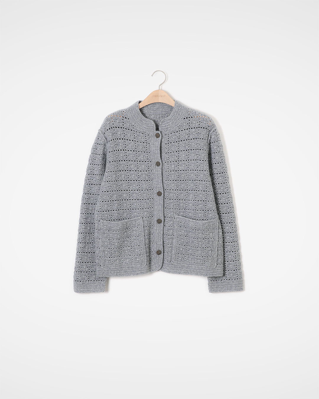 손뜨개를 연상시키는 크로셰 조직과 펀칭 디테일이 입체적인 텍스처를 만들고, 리브 밴드넥과 빈티지 무드의 버튼이 단정한 분위기를 더합니다. 큼직한 패치 포켓으로 실용성을 높였으며, 세미 루즈 핏이라 가을엔 아우터처럼, 한겨울엔 코트 속 이너로 손이 자주 가는 아이템이에요. 차분한 그레이 톤으로 어떤 컬러와도 자연스럽게 어울립니다.