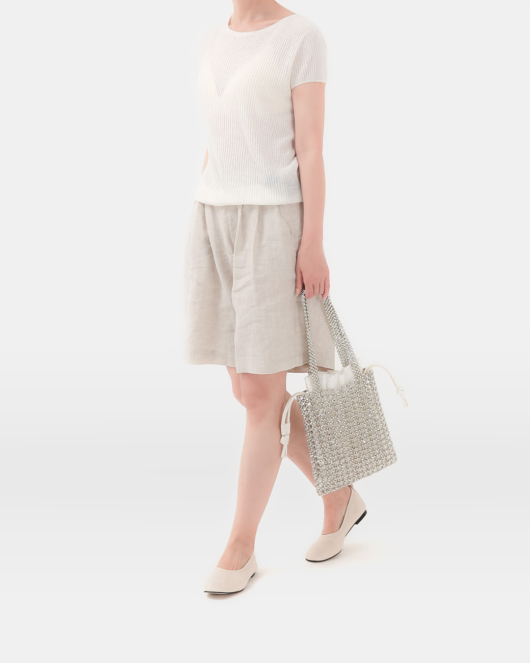 은은한 광택감의 실크가 혼방 된 신축성 좋은 린넨 니트로 어깨를 감싸는 캡소매로 시원하게 입기 좋은 여성스러운 무드의 탑입니다. 비침이 있긴 한데 부담스럽지 않은 정도입니다. 물론 개인의 성향에 따라 정도는 다를 수 있겠지만요. 우아한 럭셔리 아이템으로 추천드려요.