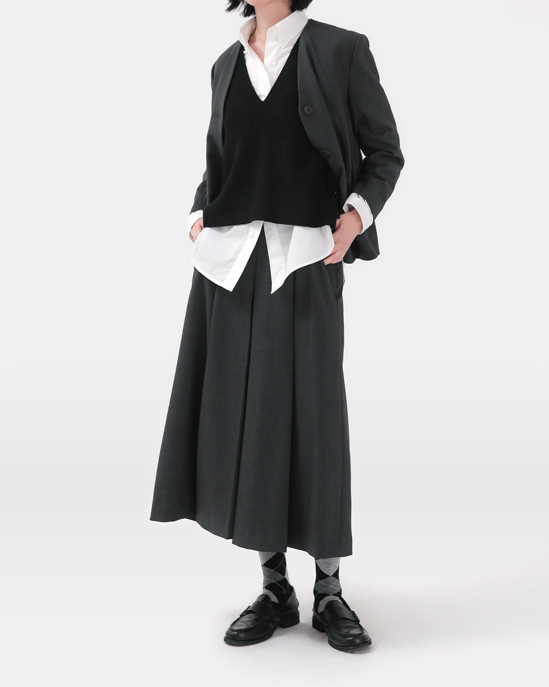 스커트처럼 보이지만, 실은 편안한 팬츠 디자인이에요. 울 100% 원단이 선사하는 고급스러운 터치와 자연스러운 드레이프가 착용 순간부터 특별한 무드를 완성합니다. 앞중심의 깊은 턱 주름이 볼륨을 만들어주어 걸을 때마다 스커트 같은 실루엣이 연출되요. 격식 있는 자리에 스커트 대용으로, 일상에서는 편안한 팬츠로 활용도 높은 아이템입니다.