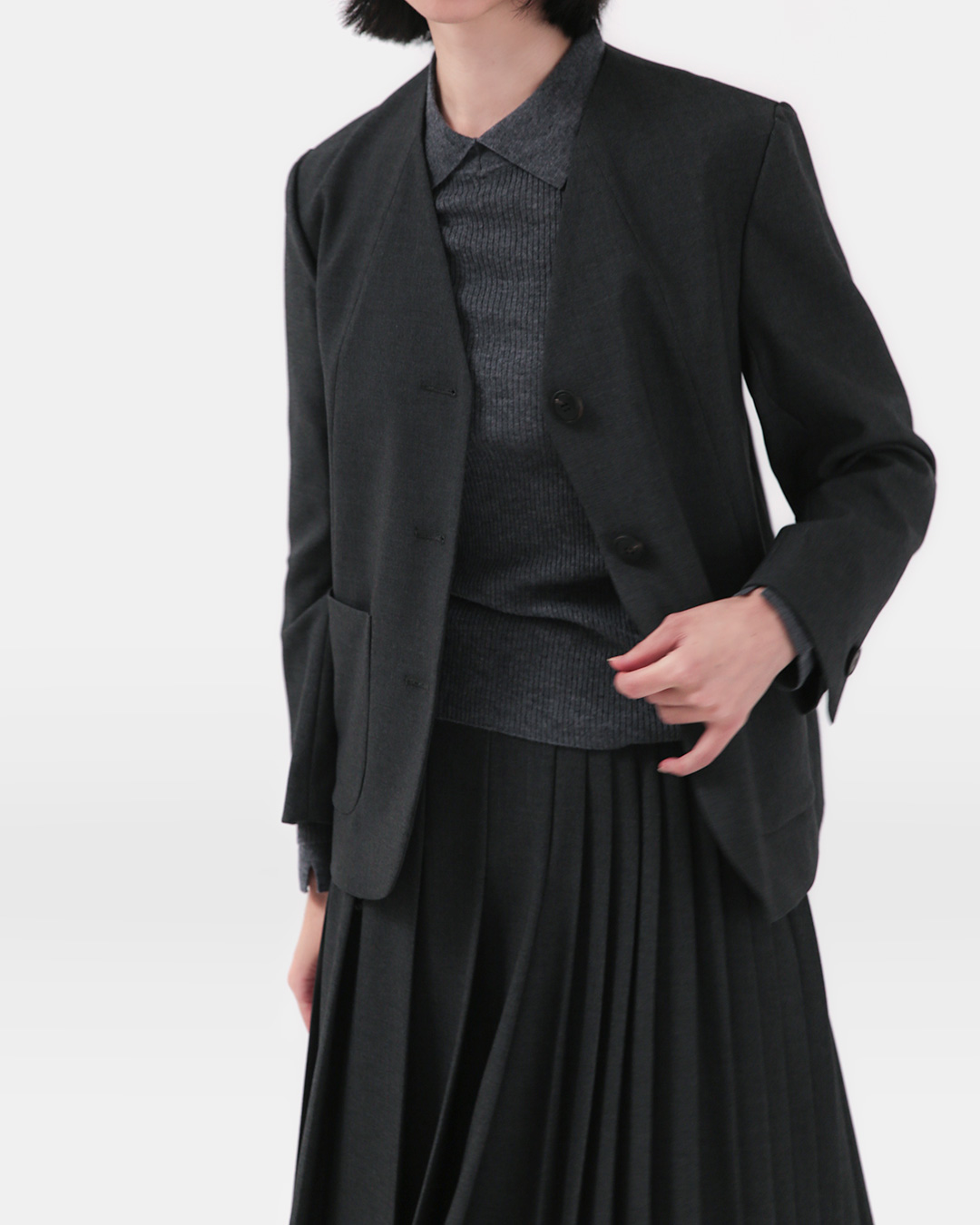 날렵하게 파인 V 넥 라인이 얼굴선을 단정하고 길게 잡아주고, 큼직한 버튼과 포켓 디테일이 클래식한 매력을 더합니다. 출근 룩은 물론, 차분한 데일리 룩에도 세련되게 어울리는 아이템이에요.