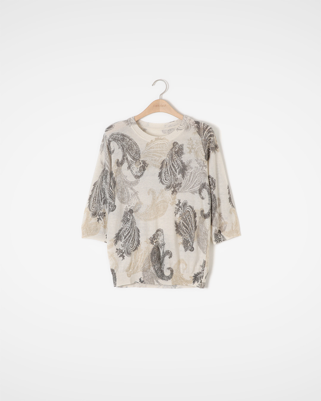 부드럽게 흐르는 실루엣 위로 페이즐리 패턴이 은은하게 피어오르는 니트 톱입니다. 크림빛 바탕에 베이지와 차콜이 조화된 세련된 톤온톤 컬러가, 차분하면서도 우아한 분위기를 연출해요. 가볍고 유연한 니트 소재로 만들어져, 이너로도 단독으로도 편안하게 즐길 수 있습니다. 소매는 7부 길이로 손목이 살짝 드러나며, 여리한 라인을 만들어줍니다. 단정한 슬랙스와 매치하면 포멀한 오피스 룩으로, 데님과 함께라면 부드러운 주말의 여유를 완성시켜주는 아이템이에요 😊