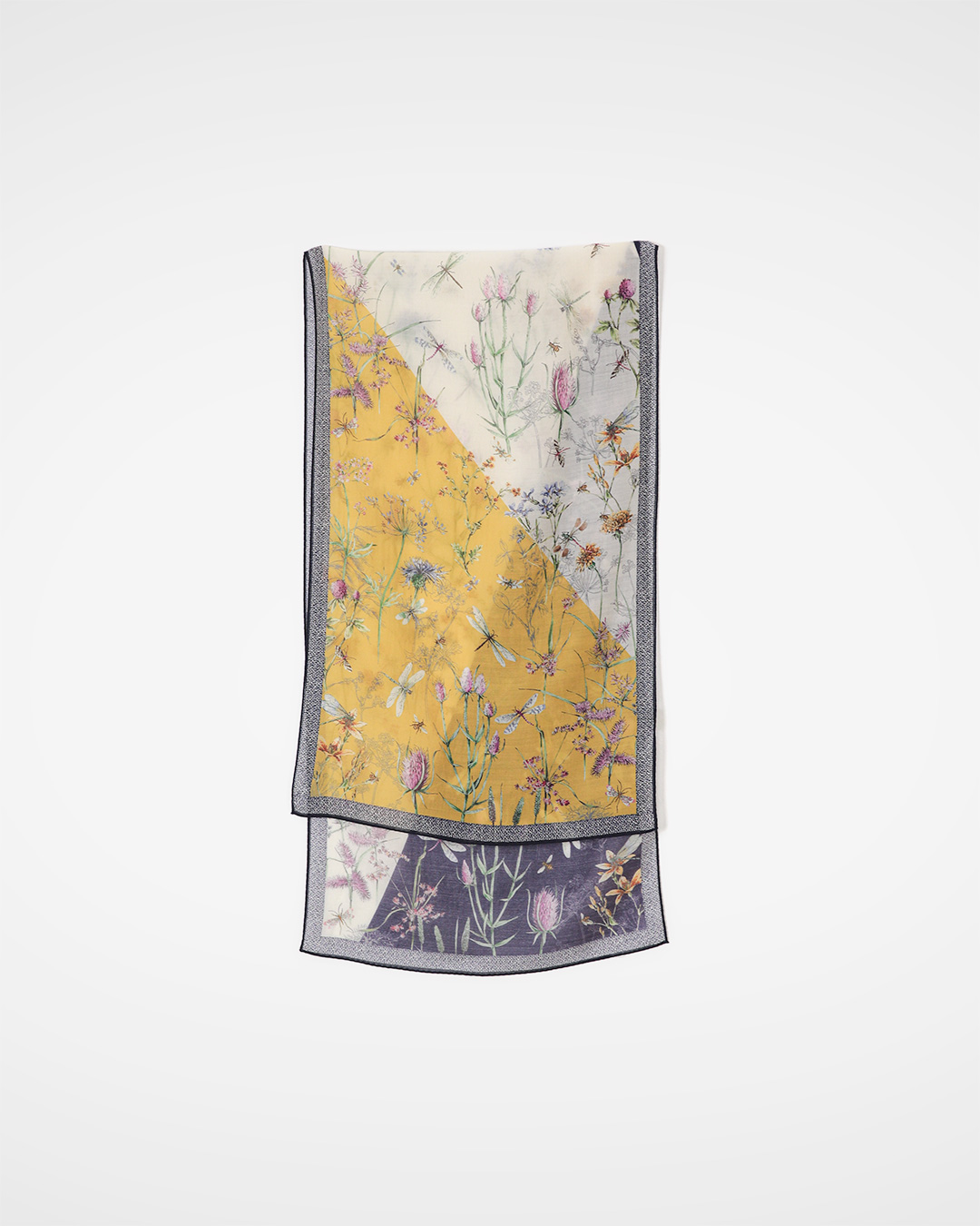 꽃, 나비, 잠자리와 같은 섬세한 자연의 장면을 담은 실크 울 혼방 보태니컬 스카프입니다. 실크 특유의 매끄러운 윤기와 울의 포근함이 조화되어, 피부에 닿을 때 부드럽고 보온감이 느껴집니다.