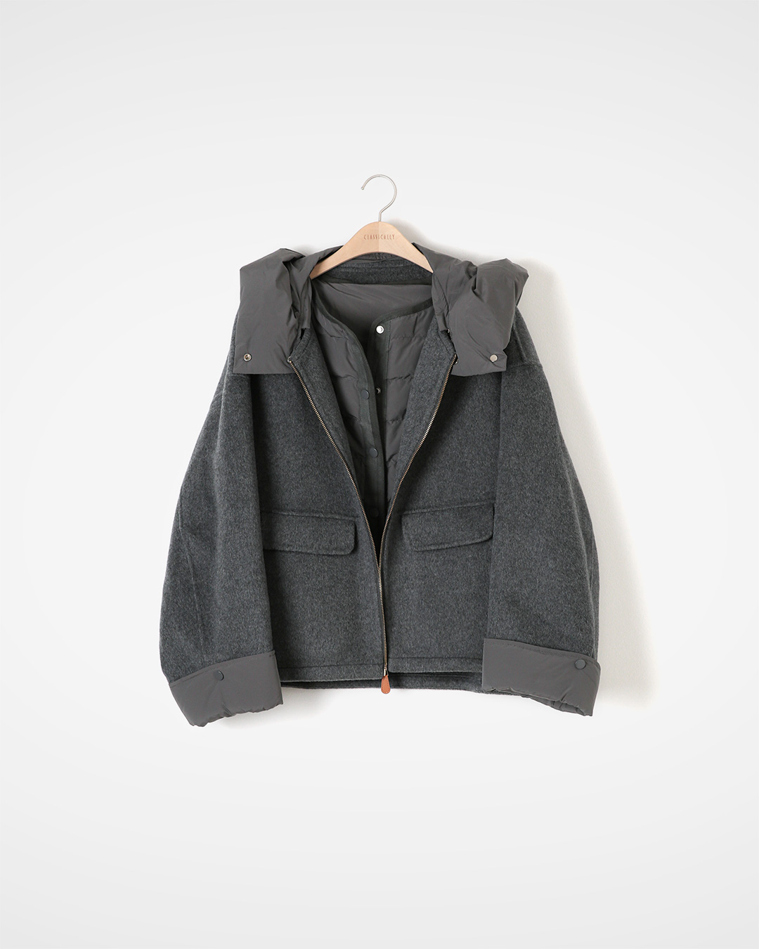 아침바람엔 든든하게, 실내에선 가볍게. 베스트와 점퍼가 한 세트로 구성된 모듈형 아우터예요. 울·알파카의 포근함 위에 탈부착 가능한 패딩 디테일을 더해, 상황에 맞게 레이어를 줄였다 늘렸다 한 벌로 여러 날을 책임집니다 😊