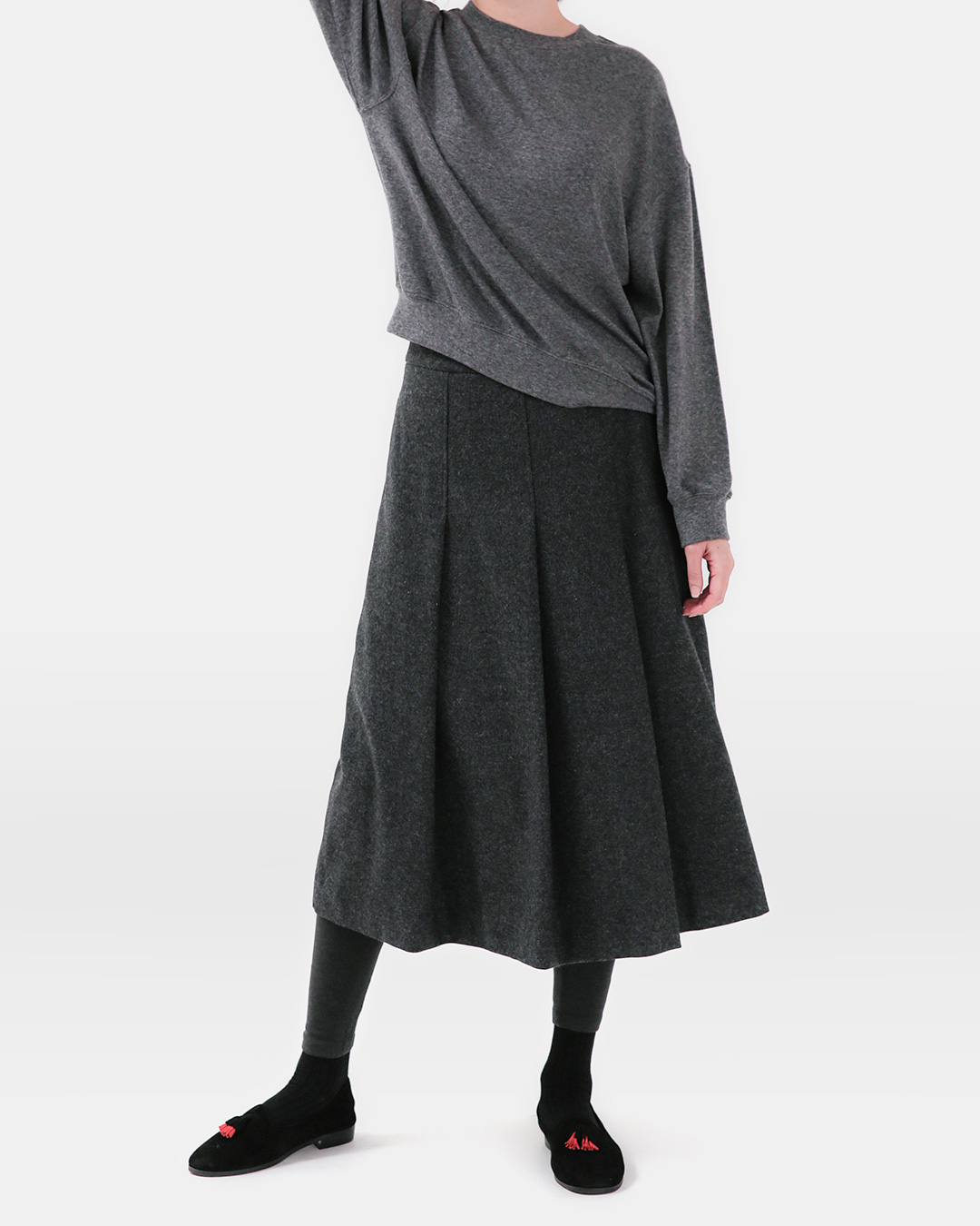 딱 떨어지는 실루엣 속에 은근한 여유가 느껴지는 플리츠 미디 스커트예요. 울 특유의 포근함과 비스코스의 유연한 흐름이 조화를 이루어, 움직일 때마다 자연스럽게 퍼지는 라인과 질감이 정말 근사합니다. 일본 TAKISADA 社의 고급 울 블렌드 원단으로 제작되어 밀도 있고 매끄러운 터치가 마음에 쏙 드실거예요. 클래식한 톤의 네이비와 그레이 컬러로 니트나 부츠와 매치하면 한겨울에도 정제된 분위기의 데일리 룩을 완성할 수 있어요 😊