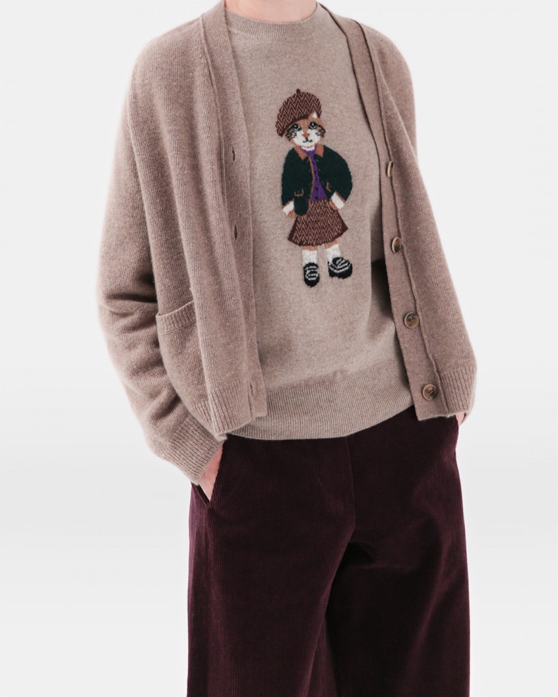 바쁜 하루, 거울 앞에서 미소가 먼저 지어지는 니트. 부드럽고 따뜻한 슈퍼파인 메리노 울 100%에 사랑스러운 ‘베레모 캣’ 자카드를 더해 데님에도, H라인 스커트에도 기분 좋은 포인트가 됩니다. 격식이 필요한 날엔 코트 안 이너로, 주말엔 셔츠 칼라만 살짝 올려 레이어드! 편안함과 단정함 사이를 우아하게 오가는 데일리 니트예요 😊
