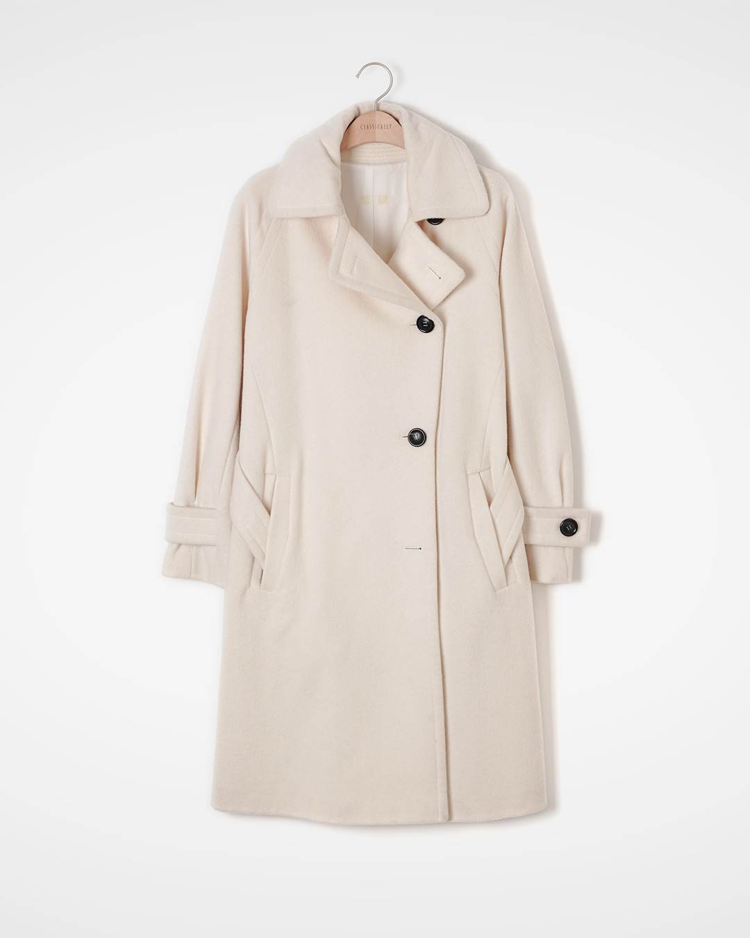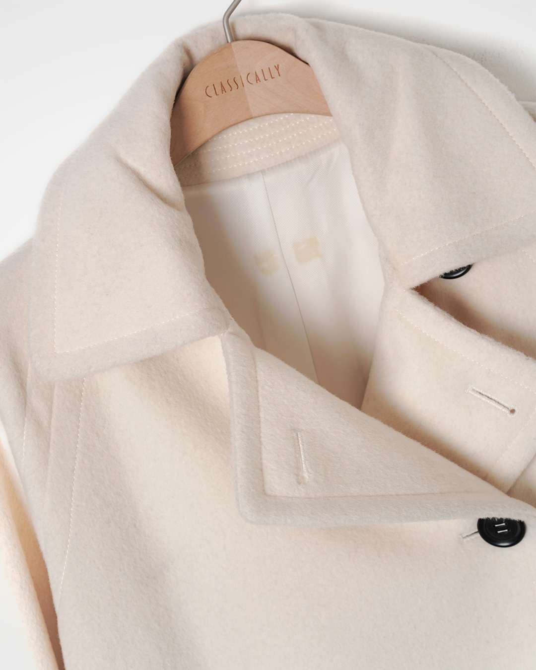 도톰한 하이 퀄리티 울 원단으로 제작된 A라인 실루엣의 벨티드 코트입니다. 같은 혼용률이라도 원단 퀄리티와 가격은 달라질 수밖에 없죠. 클래시컬리는 원단부터 보이지 않는 부자재까지, 가능한 한 최고만을 고집해 완성했습니다. 더블 브레스트 코트가 어디에나 부담 없이 걸치기 좋은 중성적인 매력의 데일리 아이템이라면, 이 코트는 드레스 업이 필요한 날에도 우아하고 귀품 있는 무드를 만들 수 있도록 여성스러운 실루엣에 집중했어요. 버튼 여밈에 따라 다양한 연출이 가능한 큼직한 칼라가 포인트로, 얼굴선을 더 작고 정돈되어 보이게 잡아줍니다. 오버사이즈는 아니지만 여유 있는 A라인으로 떨어져 편안하게 착용되며, S(55-66), F(66-77) 두 가지 사이즈로 준비되어 있습니다. 출근길에는 와이드 블랙 팬츠와 매치해 버튼을 오픈하고 무심하게 시크한 분위기로, 연말 모임에는 클래식한 블랙 드레스와 함께 벨트를 묶어 라인을 강조한 페미닌 룩으로 연출해보세요 😊