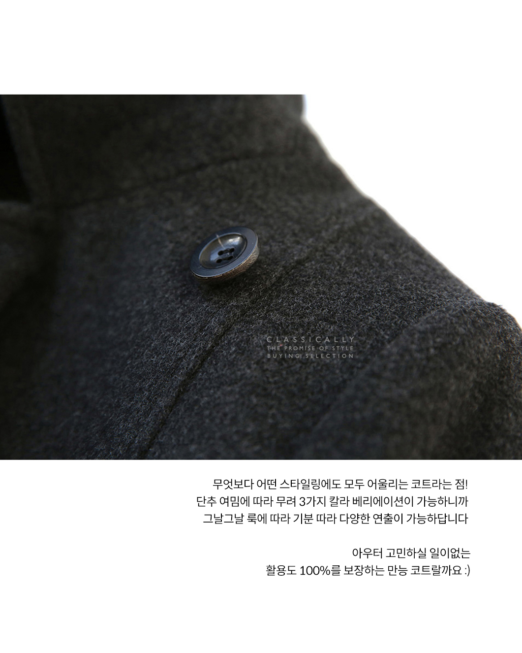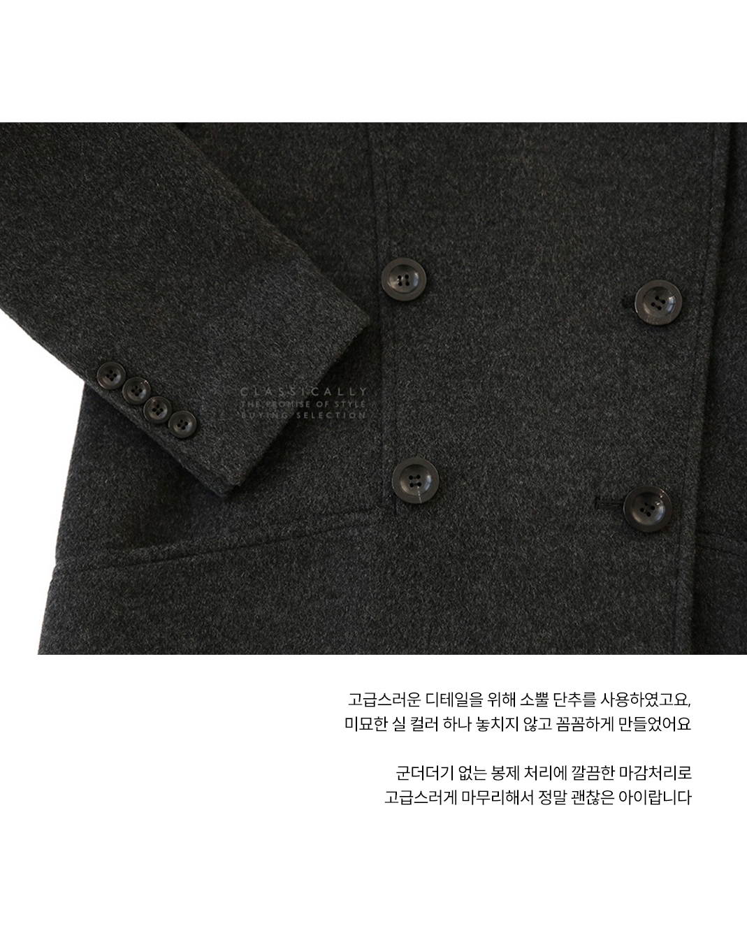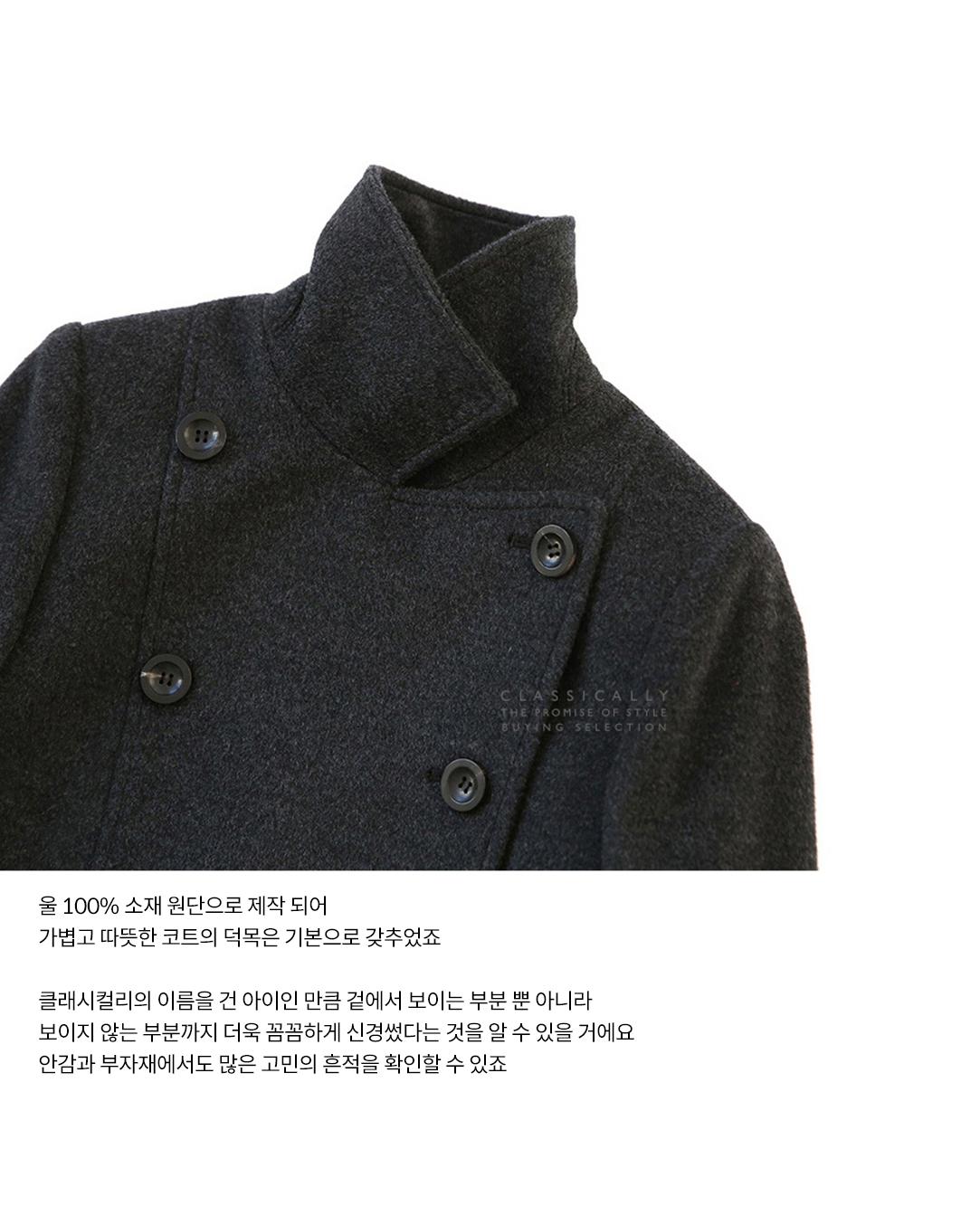 이 겨울을 무사하게 보내기 위한 아이템을 단 하나만 고른다면, 컬리의 선택은 바로 이 ‘클래시컬리 더블 코트’일 거예요. 점점 추워지는 요즘 같은 날씨에 딱 좋은 코트, 그런 아이랍니다. 우리나라에서 손꼽히는 원단 업체의 100% 울 라인으로 제작해 가볍고 따뜻한 코트의 덕목을 기본으로 갖췄어요. 하이 브랜드에서도 쉽게 선택하지 못하는 고가 원단이라, 이 원단을 결정하던 순간엔 진짜 마음이 조금 떨리더라고요. 어디에나 툭 걸치기 좋은 단정함, 그리고 꾸밈 없이도 세련된 무드. 타임리스한 디자인이라 요즘 같은 쌀쌀한 날씨에 자꾸 손이 갑니다. 클래시컬리의 이름을 건 아이인 만큼 겉에서 보이는 부분뿐 아니라 보이지 않는 부분까지 꼼꼼하게 신경 썼다는 걸 느끼실 거예요. 무엇보다 어떤 스타일링에도 잘 어울리는 코트라는 점. 캐주얼한 데님에도, 페미닌한 원피스에도 자연스럽게 붙어서 아우터 고민이 확 줄어듭니다. 활용도 100%를 보장하는 만능 코트. 세련되고 고급스러운 원단, 디자인, 핏까지 삼박자를 모두 갖춘 사랑스러운 아이예요. 따뜻한 겨울을 위해, 후회 없이 선택해 보세요 😊