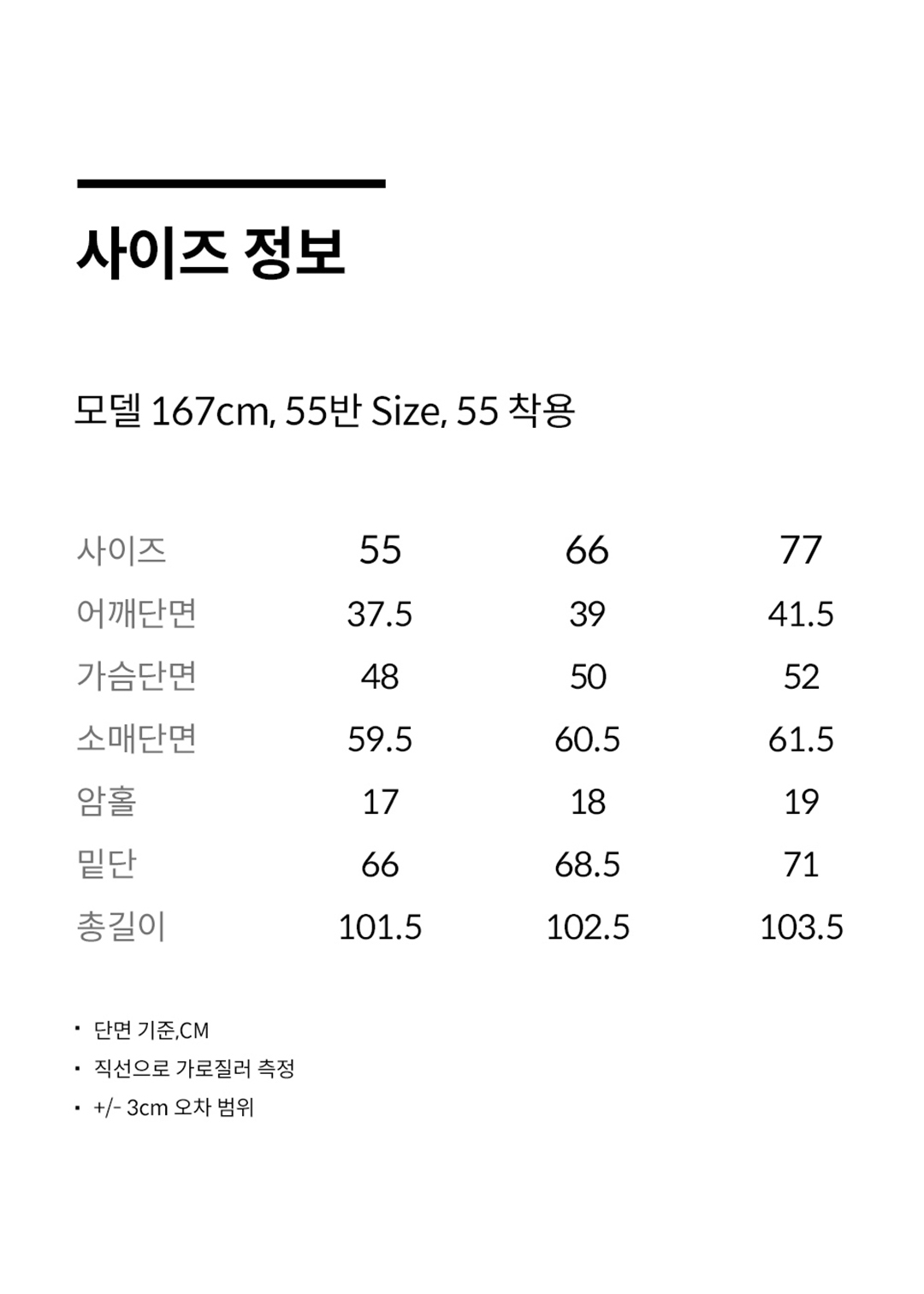 55: Total length 101.5, shoulder 37.5, chest 48, hem 66, sleeve length 59.5, sleeve width 17, sleeve end 13.5