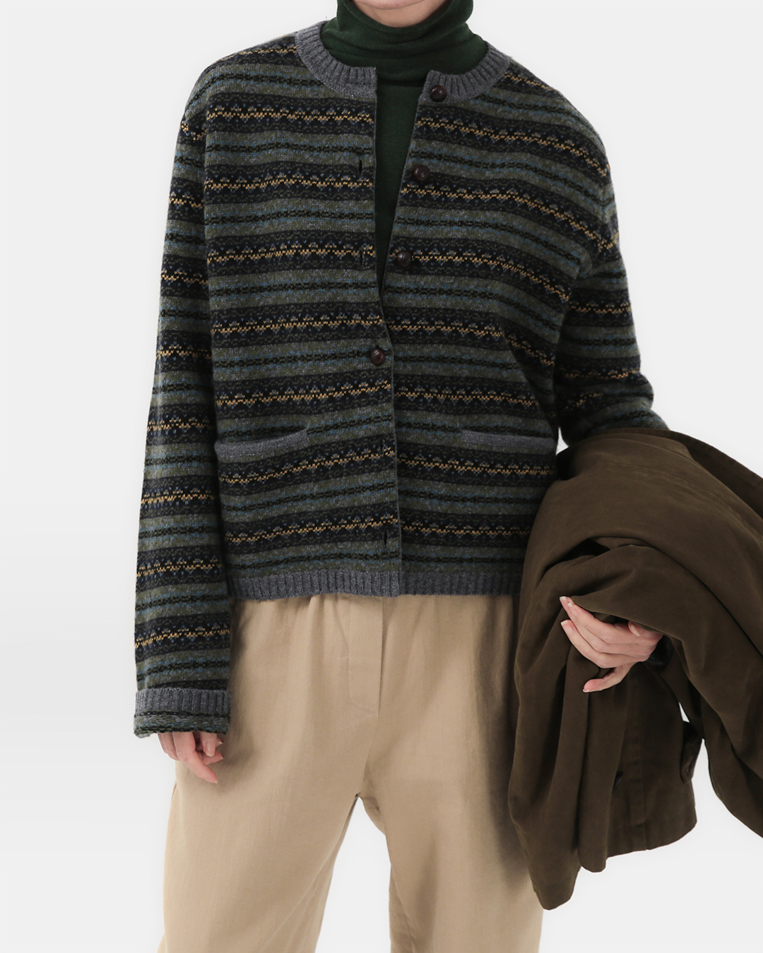 100퍼센트 울 소재로 제작된 가디건입니다. 컬러믹스와 패턴이 아름다운 클래식한 무드의 디자인으로 쉽게 찾기 힘든 매력적인 제품입니다. 단추와 포켓까지 디테일도 매력적인 아이! 단품으로 입어도 좋고 코트 안에 레이어드 해도 좋은 룩에 감도를 더해주는 아이템입니다. M(55-66), L(66-77) 사이즈로 만나보세요 😊