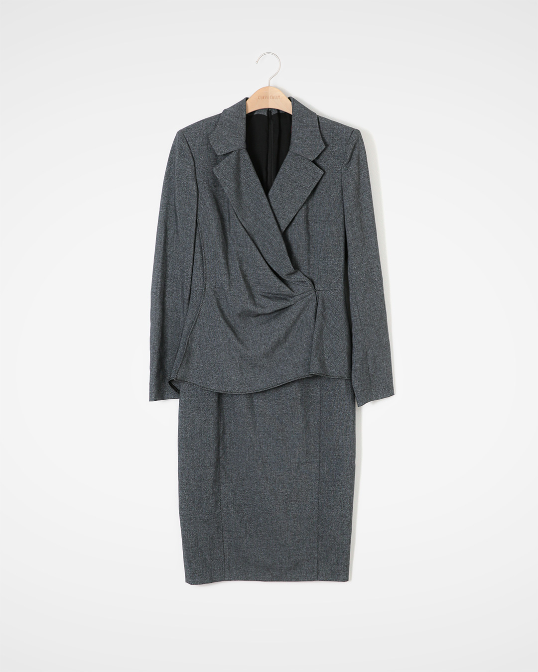 자켓을 걸친 듯 보이는데, 한 벌로 끝나는 옷. 그 편의성이 제대로 살아있는 아이템이에요. 라펠 라인으로 상체가 정돈돼 보이고, 허리 쪽 드레이프가 몸의 굴곡을 부드럽게 감춰줘서 사진도 실제도 안정적인 실루엣이 나옵니다. 앞에서 보면 랩 자켓처럼, 옆에서는 페플럼처럼 흐르며 아래는 슬림한 스커트 라인으로 정리되는 구조예요. 이 조합이 격식과 여성스러움을 동시에 만들어줍니다 😊