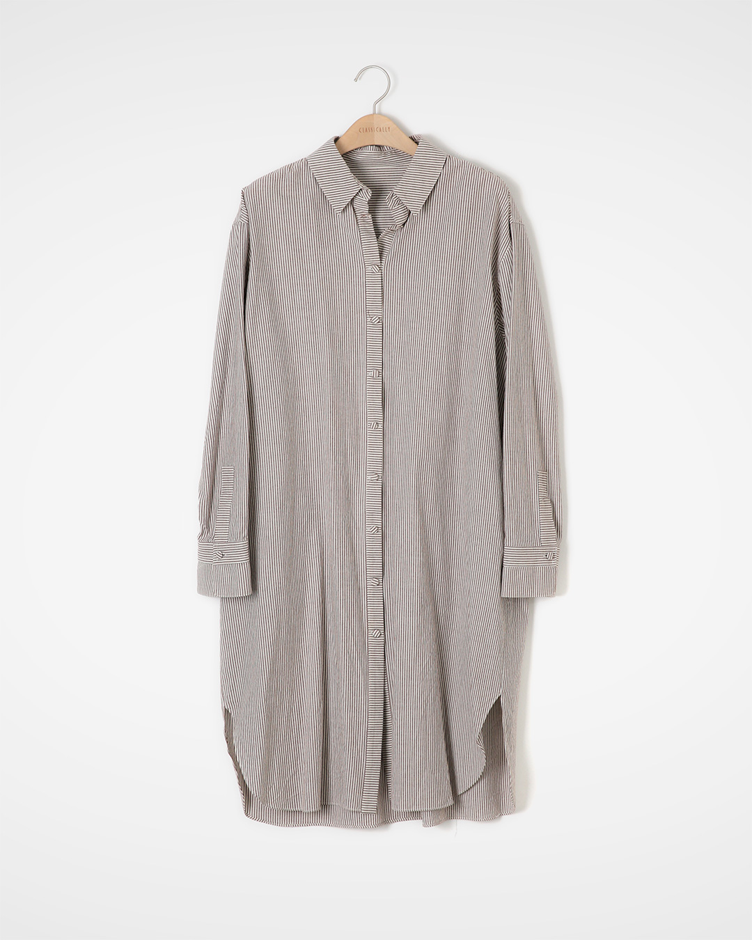 바디에 들러붙지 않는 탄탄한 코튼 100%로, 한 번 입으면 이거 편한데 단정하다는 느낌이 바로 오는 셔츠드레스예요. 스트라이프가 전부 같은 방향이 아니라, 부분적으로 결을 바꿔 배치해서 심플한 디자인에 은근한 디테일을 더했습니다. 물 빠진 색처럼 부드러운 스트라이프가 따뜻한 바탕 컬러와 어우러져 네추럴한 분위기를 만들고, 소프트한 텍스처 덕분에 차갑게 보이지 않아요. 단독으로는 무릎 아래까지 오는 원피스로, 레이어링하면 가벼운 아우터처럼 더 멋이 납니다. 니트·레깅스와 함께 툭 걸치면 정돈된 편안함 쪽으로 딱 떨어져요. 겨울엔 코트 속 이너 레이어로도 활용도가 높습니다 😊