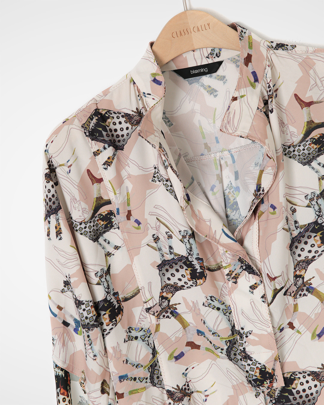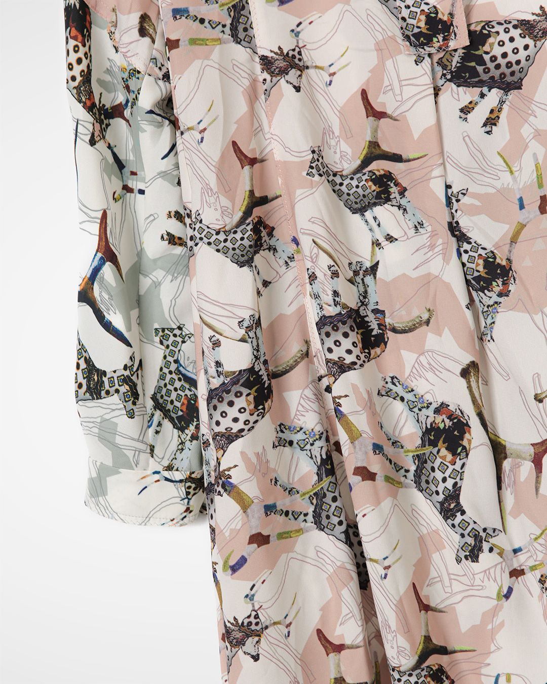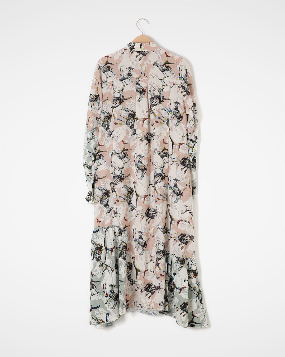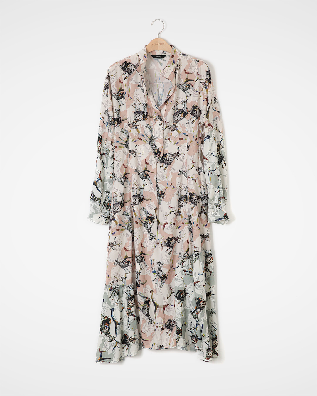 옷 한 벌이 그날의 기분을 다 바꿔줄 때가 있어요. 이 원피스는 프린트가 이미 충분히 말해주기 때문에, 스타일링은 오히려 단순할수록 예뻐요. 바람이 스칠 때마다 원단이 가볍게 흔들리면서 프린트가 더 살아납니다. 셔츠 칼라 기반이라 얼굴선이 정돈되어 보이고, 롱 기장에 밑단 배색 패널(티어드 느낌)이 들어가 움직임이 더 드라마틱해요. 휴양지부터 도심까지, 한 벌로 완성되는 타입입니다 😊
