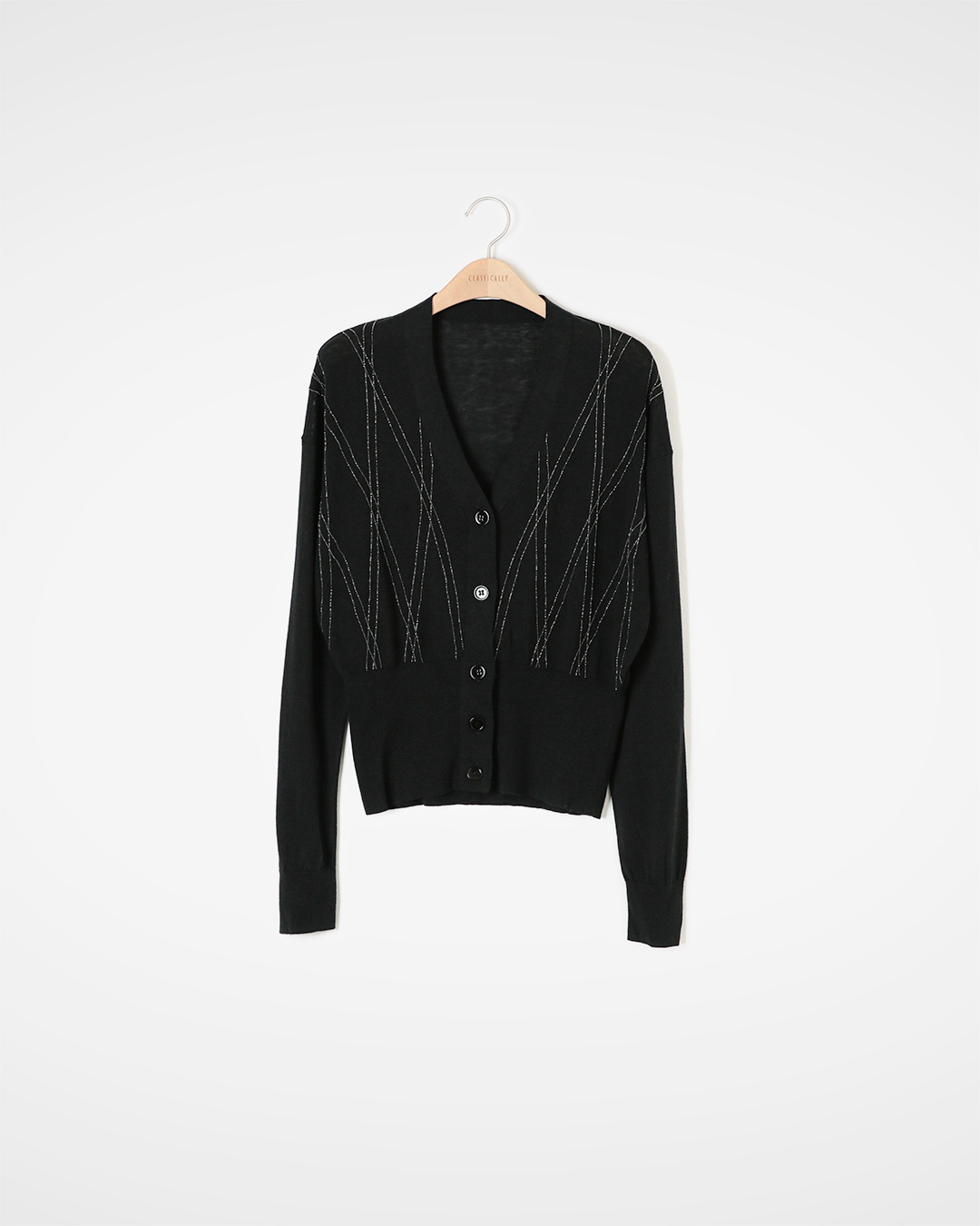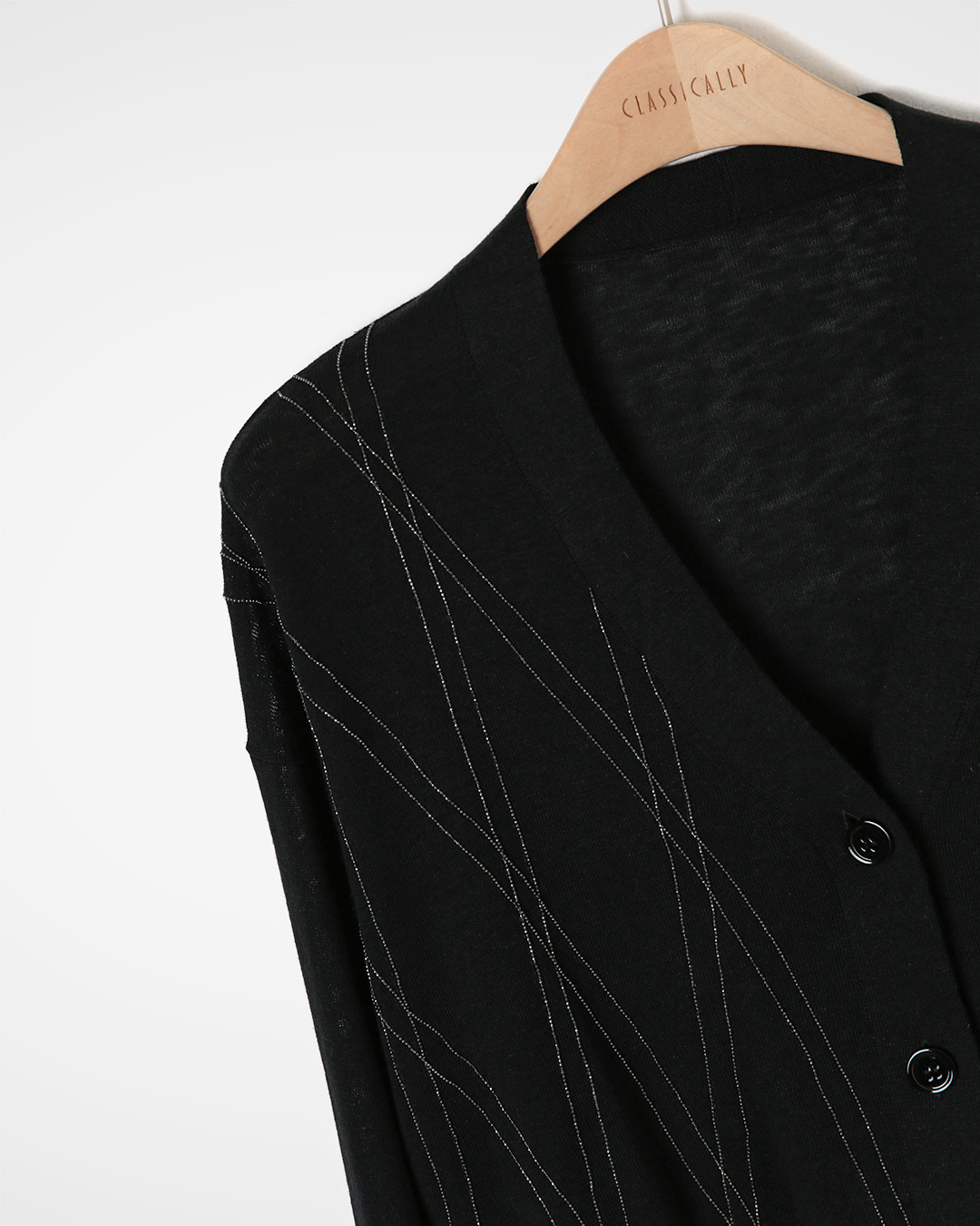 깊지 않은 V넥과 버튼 여밈으로 단정하게 마무리되고, 앞판에는 가느다란 선처럼 교차하는 스티치가 들어가 블랙의 평면감을 살짝 깨줍니다. 멀리서는 미니멀, 가까이서는 디테일! 출근 룩 위에 툭 걸쳐도, 슬리브리스 원피스 위에 레이어드해도 조용히 예쁜 균형이 좋아요 😊