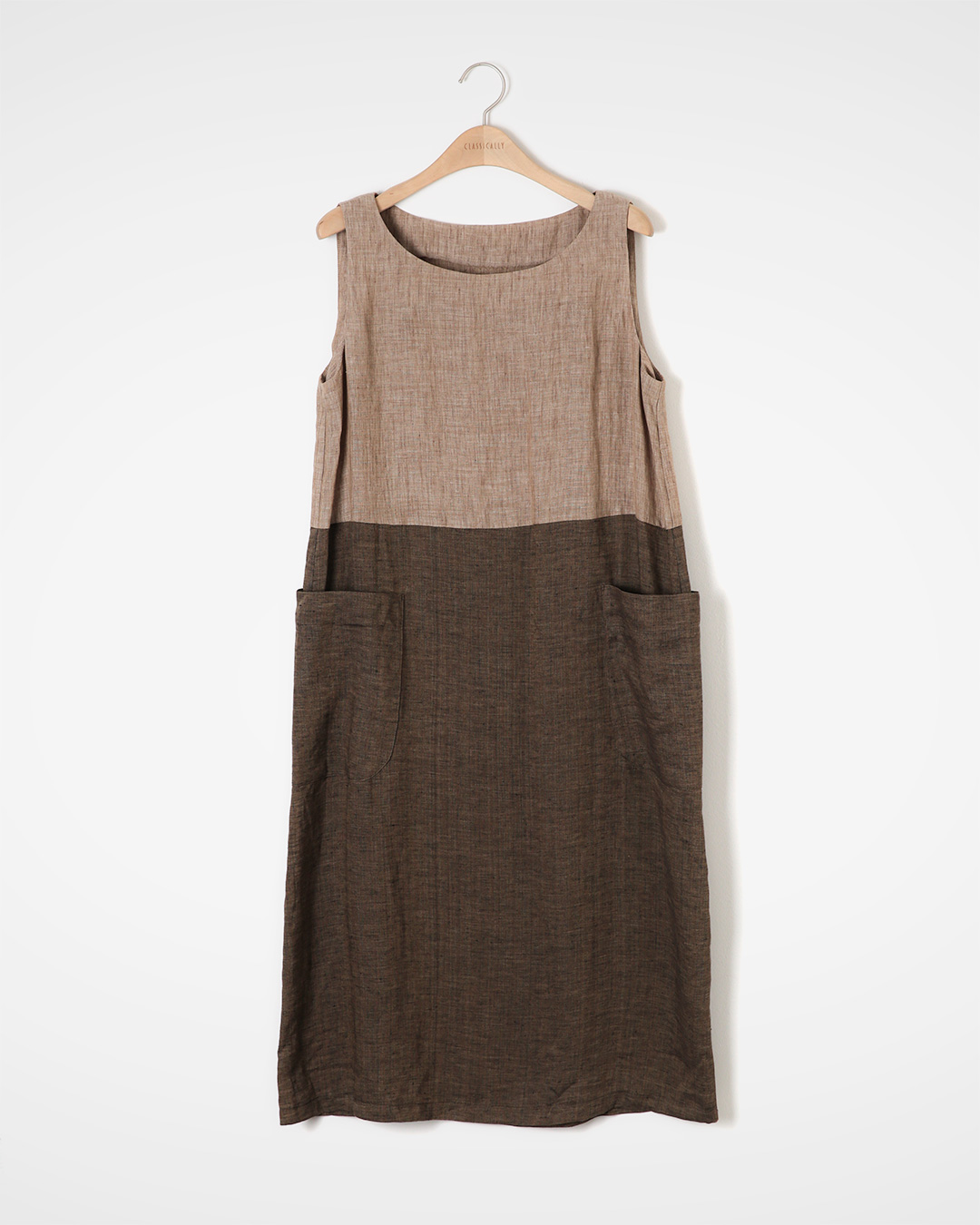 하루가 가벼워지는 옷이 있어요. 꾸미지 않아도 차분하고, 힘주지 않아도 분위기가 정돈되는 것. 이 원피스는 린넨 특유의 드라이한 촉감과 톤온톤 배색으로 편한데 멋있어 보이는 균형을 아주 잘 잡아줍니다. 상의는 밝은 톤으로 얼굴빛을 환하게, 스커트 라인은 깊은 브라운 계열로 안정감을 주는 배색이라 단독으로 입어도 밋밋하지 않아요. 넉넉한 암홀과 일자 실루엣이 바디를 들러붙지 않게 정리해주고, 양쪽 포켓이 실용까지 챙겨서 여름 데일리로 손이 자주 가는 타입입니다 😊