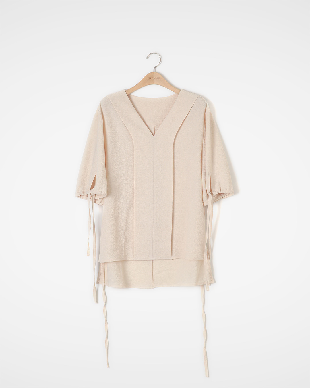 이태리에서 공수한 텍스처 원단이 빛을 과하게 튕기지 않으면서도 결감으로 고급스러움을 만들어 주고, 입는 순간 실루엣이 자연스럽게 살아납니다. 와이드한 소매통에 게더 스트랩 디테일을 더해 팔 라인을 부드럽게 감싸며 볼륨을 만들어줘요. 여유 있는 핏이라 편안하게 착용되지만, 브이넥 라인의 ‘안단이 밖으로 나온 듯한’ 반전 디테일이 전체 인상을 또렷하게 잡아줘서 출근 룩부터 주말 약속까지 두루 잘 어울립니다. 허리 라인에는 실고리가 있어 같은 원단의 벨트를 더할 수 있어요. 벨트 없이 툭 떨어뜨리면 느슨한 우아함, 벨트를 하면 허리 실루엣이 살아나는 정제된 무드. 한 벌로 '느낌’을 바꿀 수 있는 탑이라 옷장에 두면 자주 손이 갈 거예요 😊
