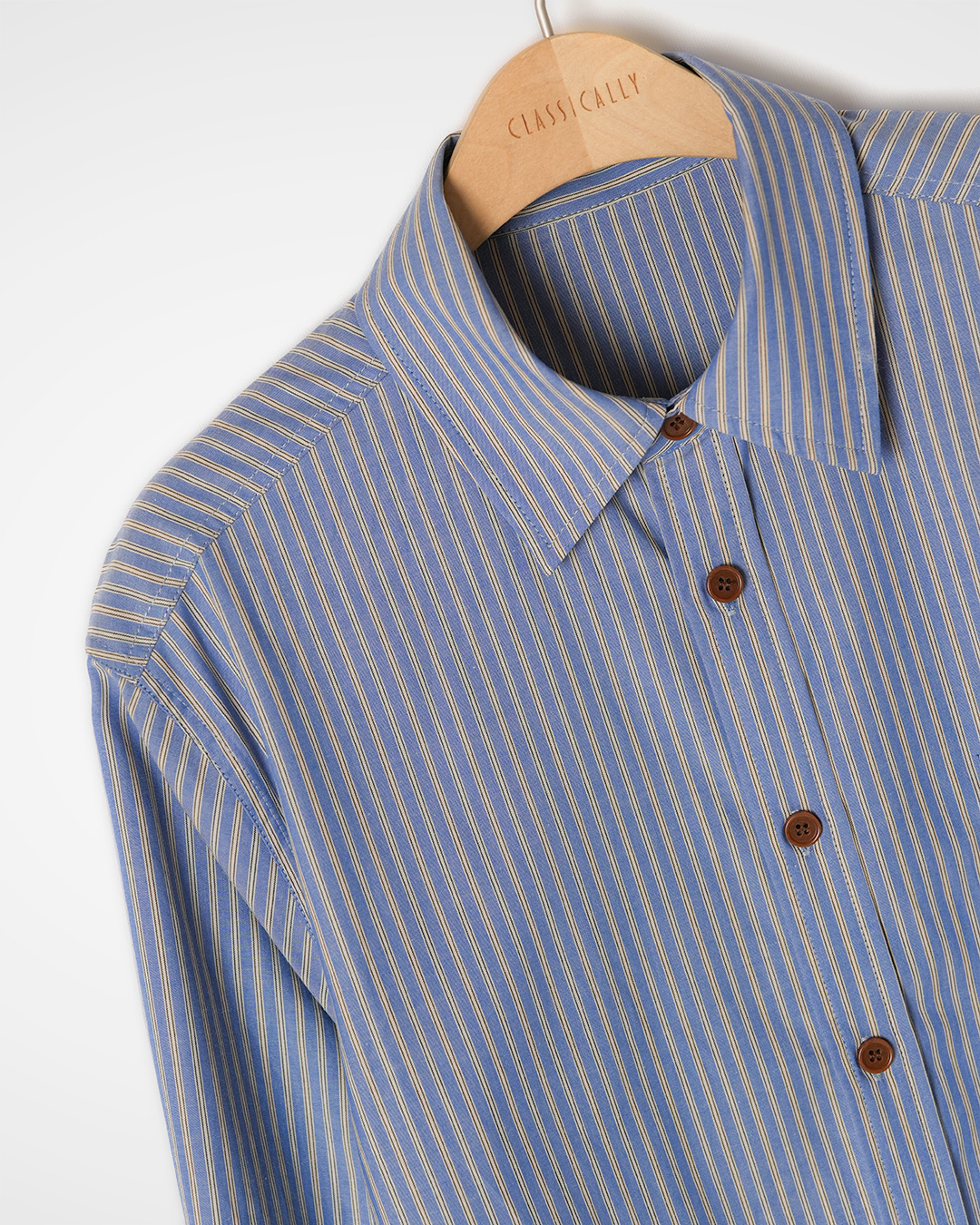 블루 스트라이프가 차분하면서도 산뜻한 느낌을 주는 셔츠예요. 부담 없이 입기 좋으면서도, 한 번 입으면 분위기를 깔끔하게 정리해주는 컬러감이에요.