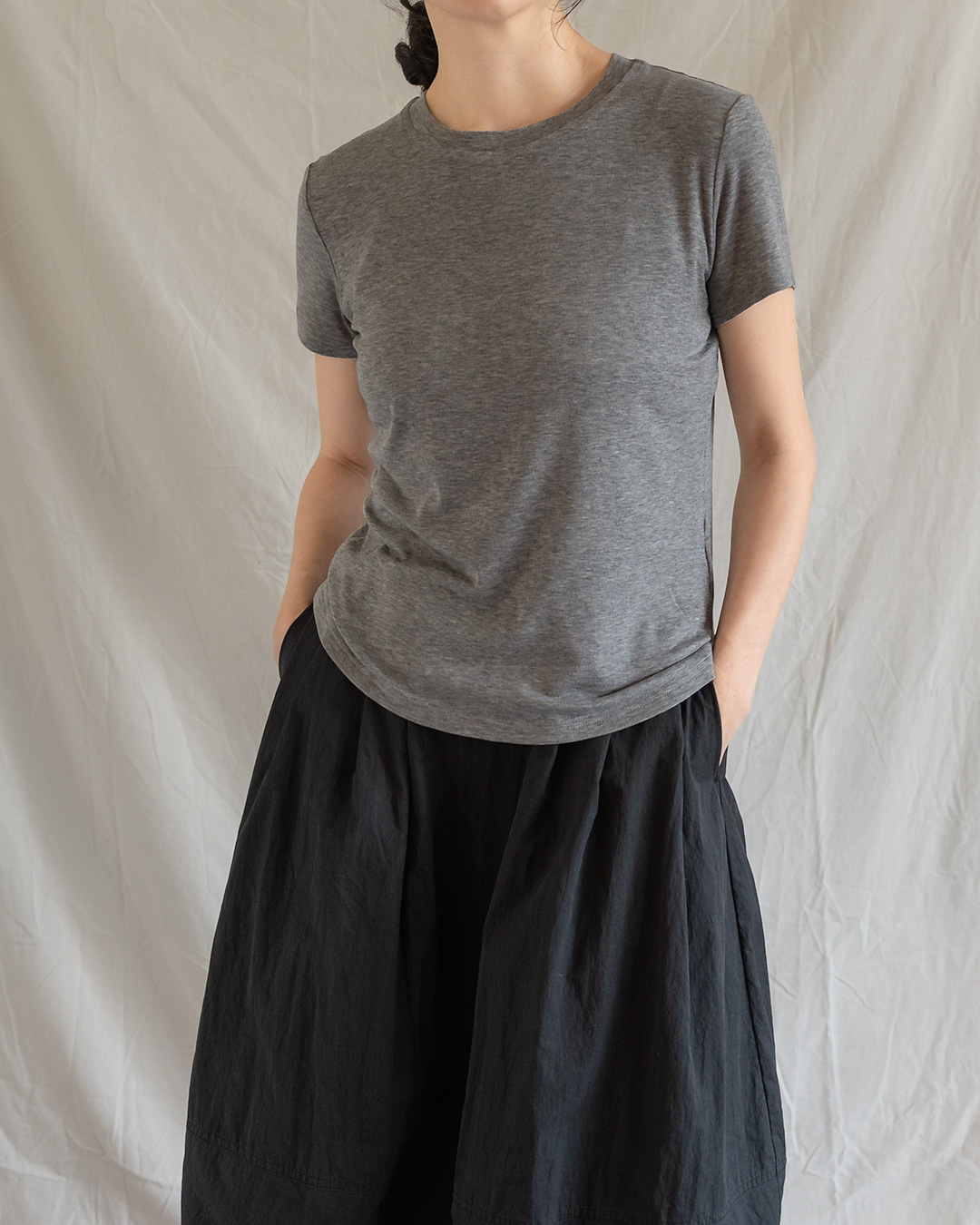 배송 안내 : 영업일 기준 약 10일 소요됩니다 티셔츠는 가장 자주 입는 아이템이라서, 오히려 원단이 좋지 않으면 금방 손이 가지 않게 되죠. 이 제품은 입는 순간 왜 좋은 티셔츠인지 바로 느껴지는 타입이에요. 피부에 닿는 감촉이 부드럽고, 얇고 가볍게 흐르면서도 지나치게 후줄근해 보이지 않아 단정한 인상을 남깁니다. 하나만 입어도 충분히 괜찮고, 자켓이나 가디건 안에 받쳐 입었을 때도 매무새가 깔끔해서 일상과 출근길 사이를 자연스럽게 오갈 수 있는 티셔츠예요.