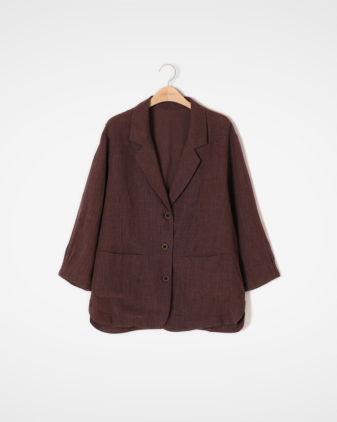 여름 자켓은 필요하지만, 막상 손이 가는 제품은 많지 않습니다. 너무 포멀하면 날씨와 어울리지 않고, 너무 힘을 빼면 차림이 쉽게 느슨해 보이기 때문이지요. 이 자켓은 그런 고민 사이에서 꽤 좋은 균형을 보여줍니다. 린넨 특유의 가볍고 시원한 터치는 살리면서도, 브라운에 자주빛이 은은하게 감도는 컬러 덕분에 전체 인상은 훨씬 차분하고 우아하게 정리돼요. 여름에도 단정함을 포기하고 싶지 않은 분들께 특히 반가운 아이템입니다. 린넨 75%, 텐셀 25% 혼방 소재는 보기 좋은 것에만 그치지 않아요. 린넨의 산뜻하고 드라이한 감촉에 텐셀의 부드러운 유연함이 더해져, 빳빳하기보다 자연스럽게 흐르는 실루엣을 만들어줍니다. 그래서 입었을 때 몸을 과하게 감추지도, 불편하게 조이지도 않으면서 단정한 여유를 남기지요. 셔츠 위에 가볍게 걸쳐도 좋고, 나시나 원피스 위에 더하면 차림이 한층 정리됩니다. 출근길부터 주말의 약속, 여행지의 저녁까지 생각보다 폭넓게 이어질 자켓이에요 😊