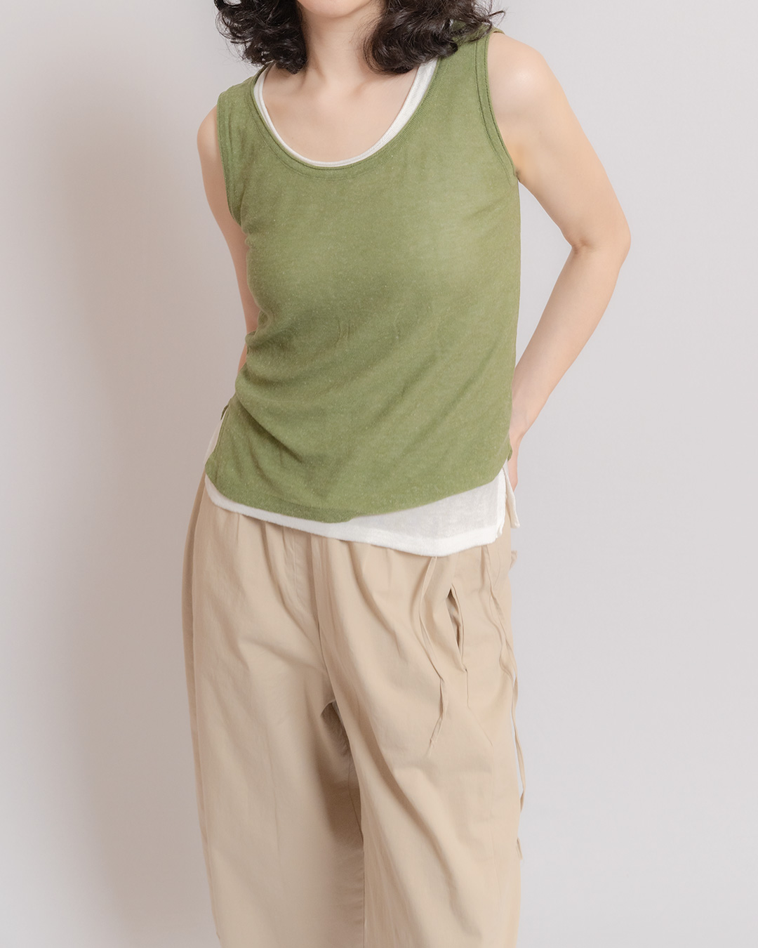 이런 민소매 톱은 있으면 분명 자주 입게 되는데 막상 마음에 드는 한 장 찾기는 쉽지 않습니다. 이 제품은 코튼의 편안함에 린넨의 드라이한 터치, 아세테이트의 매끈함이 더해져 피부에 닿는 느낌이 가볍고 산뜻해요. 넥 라인도 너무 깊거나 답답하지 않게 정리되어 단정하게 입기 좋고, 몸을 과하게 드러내지 않는 담백한 실루엣이라 단독으로도 부담이 적습니다. 여름 자켓 안에는 물론이고, 가디건이나 셔츠를 툭 걸쳤을 때도 전체 룩을 깨끗하게 정리해주는, 손이 자주 갈 기본 아이템이에요 😊