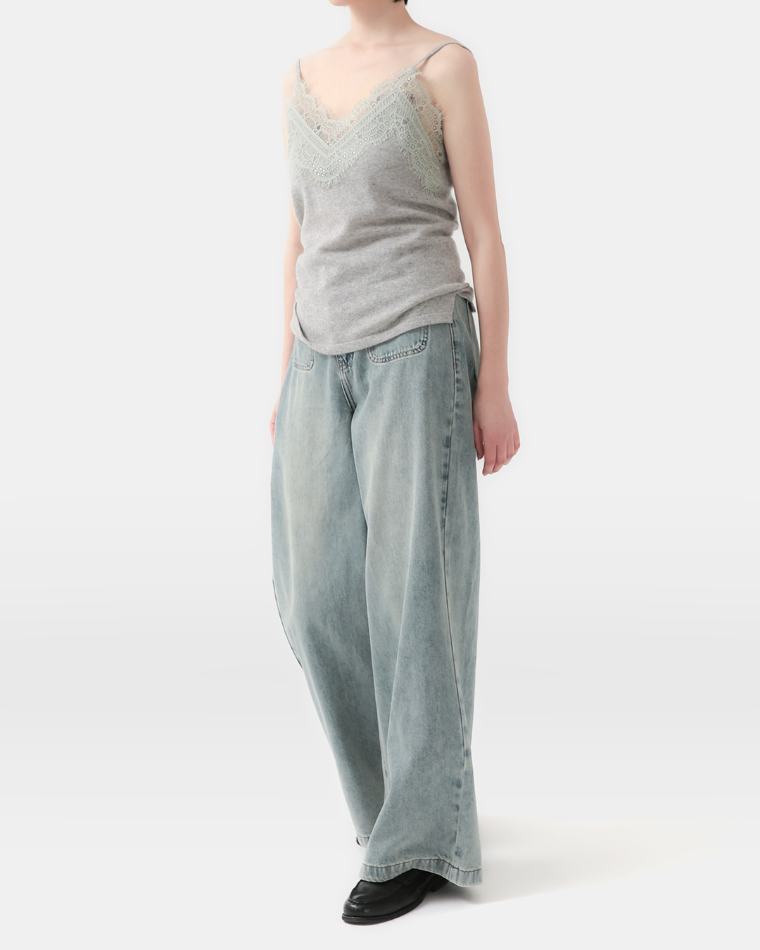 모시와 코튼이 혼방된 네추럴한 무드의 라이트 블루 진으로 자연스러운 워싱이 예쁜 팬츠입니다. 와이드 핏으로 다리가 길어 보이고 드레시한 무드를 연출하기 좋은 제품이예요 😊