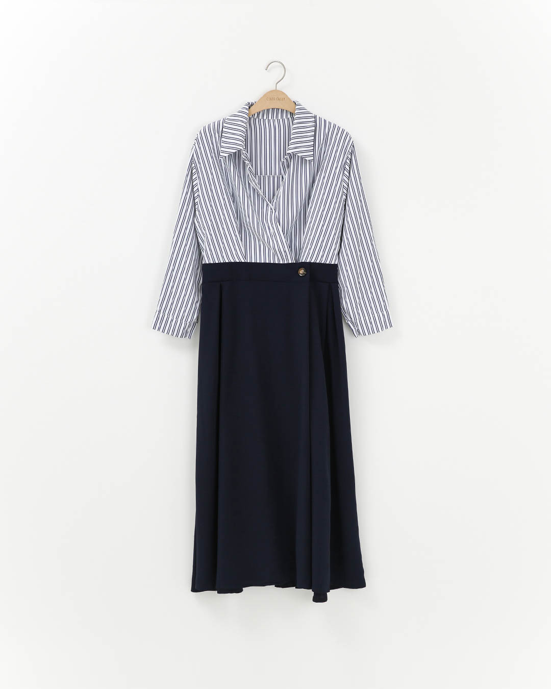 스트라이프 셔츠의 단정함과 네이비 스커트의 우아함을 한 벌에 담아, 회의 있는 날에도 주말의 전시 데이트에도 손쉽게 격을 갖춰 줍니다. 상의는 랩처럼 겹쳐 여리한 넥 라인을 만들고, 허리 버튼 디테일이 실루엣을 깔끔히 잡아줘요—편하지만 차려입은 느낌은 확실한, 진짜 실용 명작 원피스입니다. 하루를 덜 복잡하게, 더 우아하게. 이 한 벌이면 일정표가 길어도 끝까지 단정합니다 😊