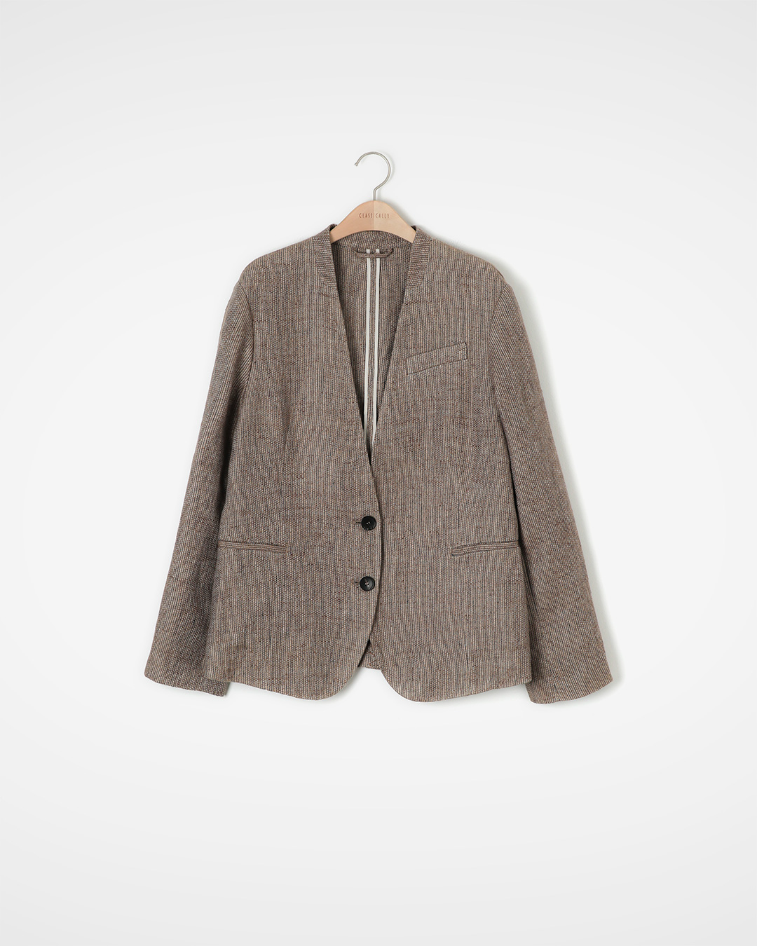 • 브라운과 그레이가 섞인 내추럴 컬러감의 린넨 혼방 원단 • 포멀한 무드의 테일러링을 살린 간결한 노카라 디자인 • 힙을 살짝 덮는 세미 크롭 기장으로 다양한 하의와 매치 가능 • 전면 2버튼 클로징, 가슴 웰트 포켓과 양쪽 플랩 포켓으로 실용성 더함 •여유 있는 암홀과 슬림한 소매로 가벼운 이너와도 자연스럽게 매치