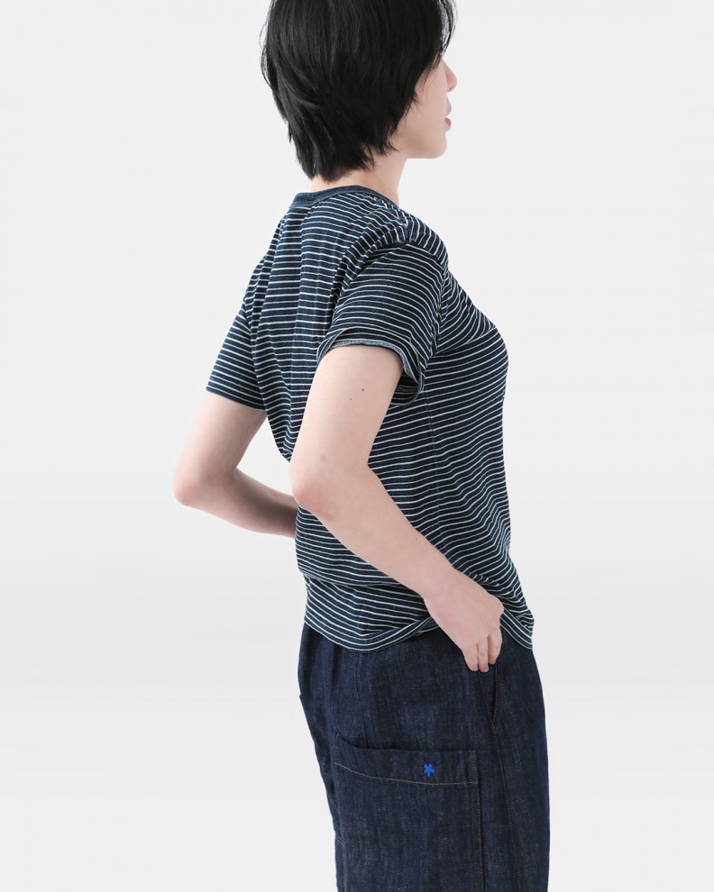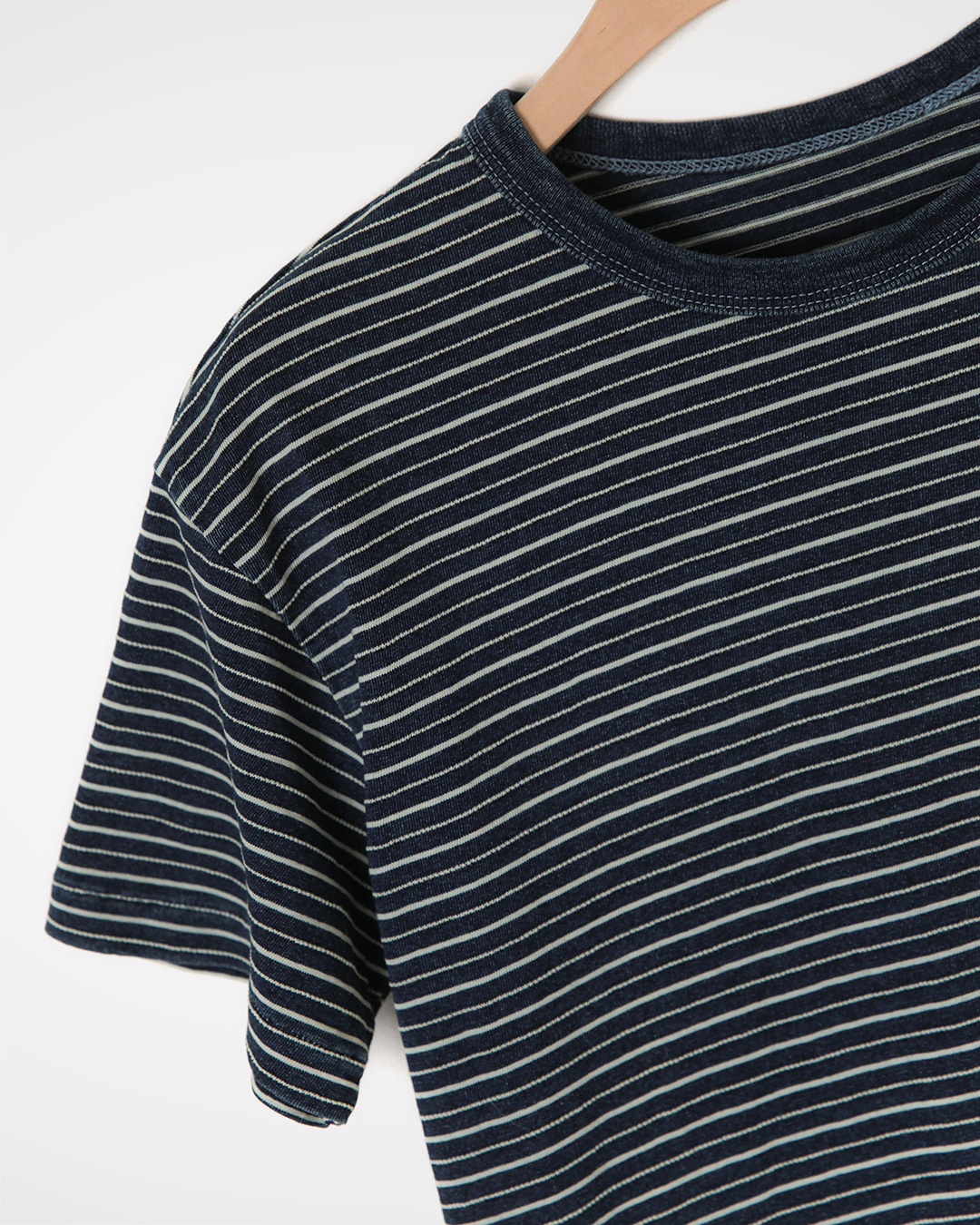 · 네이비와 아이보리의 클래식한 스트라이프 조합 · 통기성 좋은 코튼 100% 원단 · 부드러운 착용감과 적당히 여유 있는 실루엣 · 단품은 물론 셔츠나 자켓 속 이너로도 활용도 높음 · 꾸민 듯 안 꾸민 듯, 간결한 데일리 룩에 제격