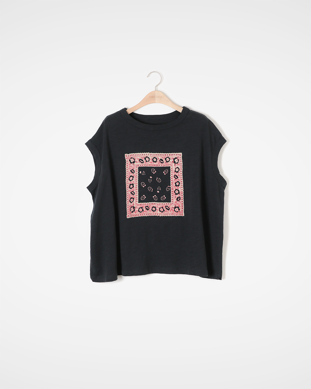 햇살 가득한 여름, 옷차림은 가볍지만 무심한 듯 감각적인 포인트가 필요할 때가 많죠. 넉넉한 암홀이 위쪽 팔 라인을 편하게 감싸 주고, 정제된 블랙 베이스 위에 스카프를 접어 놓은 듯한 핑크 밴다나 프린트가 ‘딱 한 끗’의 위트를 더해 줍니다. 밴다나 프린트는 한 장 한 장 수작업 실크 스크린으로 찍어내 오히려 오차가 주는 독특한 멋이 살아 있어요. 데님 팬츠 하나만 곁들여도, 재킷 속 이너로 살짝 보여도 룩 전체에 활기를 불어넣어 주는 아이템이에요 😊