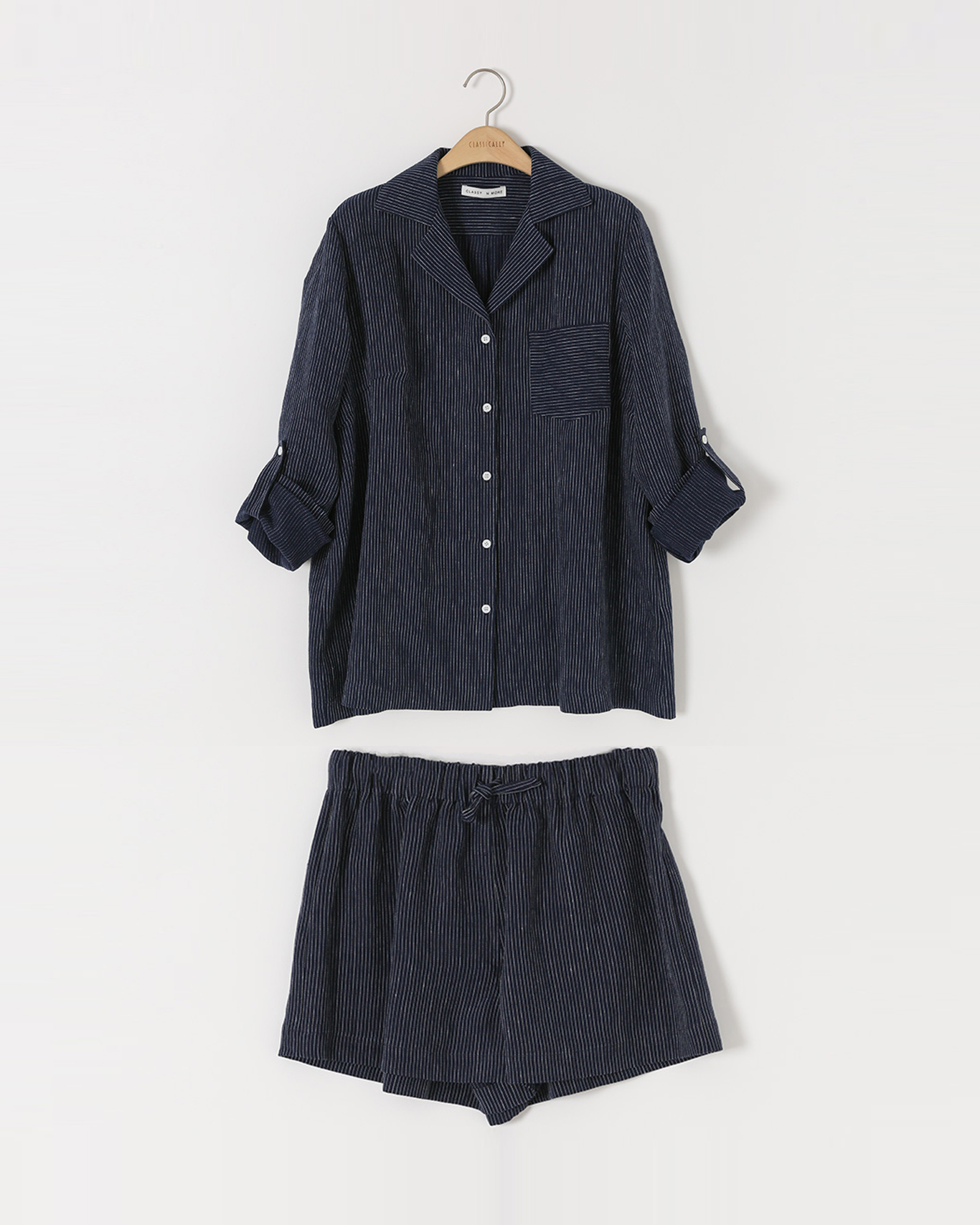 린넨 100% 특유의 산뜻한 터치에 스트라이프 원사가 더해져, 편안히 잠드는 순간에도 짧은 외출에도 기분 좋은 만족감을 선사합니다. 넉넉한 팬츠 포켓과 일본산 탄탄한 허리 밴드, 셔츠 걸이를 위한 뒷면 고리, 소매 롤업 탭까지—섬세한 디테일로 실용성을 놓치지 않았어요.
