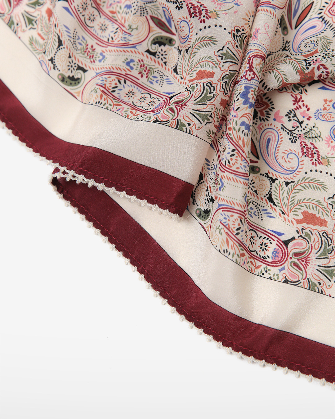 아침 셔츠 위에 살포시 매어도, 저녁 토트백 손잡이에 리본처럼 묶어도, 한 장만으로 룩 전체가 풍성해집니다. 100% 실크 소재와 크림 바탕 위에 핑크·스카이블루·올리브가 어우러진 페이즐리 정원 패턴이 얼굴에 화사함을 선사합니다. 우아한 깊이를 더해 주는 와인빛 실크 테두리와 레이스 스티치를 더한 끝단으로 더욱 드라마틱하게 살아난 예쁨을 느낄 수 있죠. 클래시컬리가 제안하는 ‘작지만 확실한 포인트’, 오늘의 설렘을 목 끝에서부터 시작해 보세요 😊
