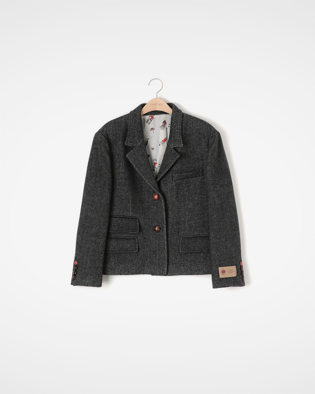캐시미어(30%)와 울(70%)이 혼방 된 헤링본 패턴의 도톰한 소재로 제작된 재킷입니다. 이태리 수입 원단으로 고급스럽고 터치감 좋은 제품이에요. 어깨 선이 살짝 내려오며 낙낙한 품으로 편안한 실루엣입니다. 포멀한 치마와 슬랙스와 코디 하셔도 좋고, 가벼운 느낌의 청바지와도 잘 어울려요. 타임에서도 같은 원단으로 제작된 상품이 나왔더라고요. 색상만 다른 동일 원단입니다.